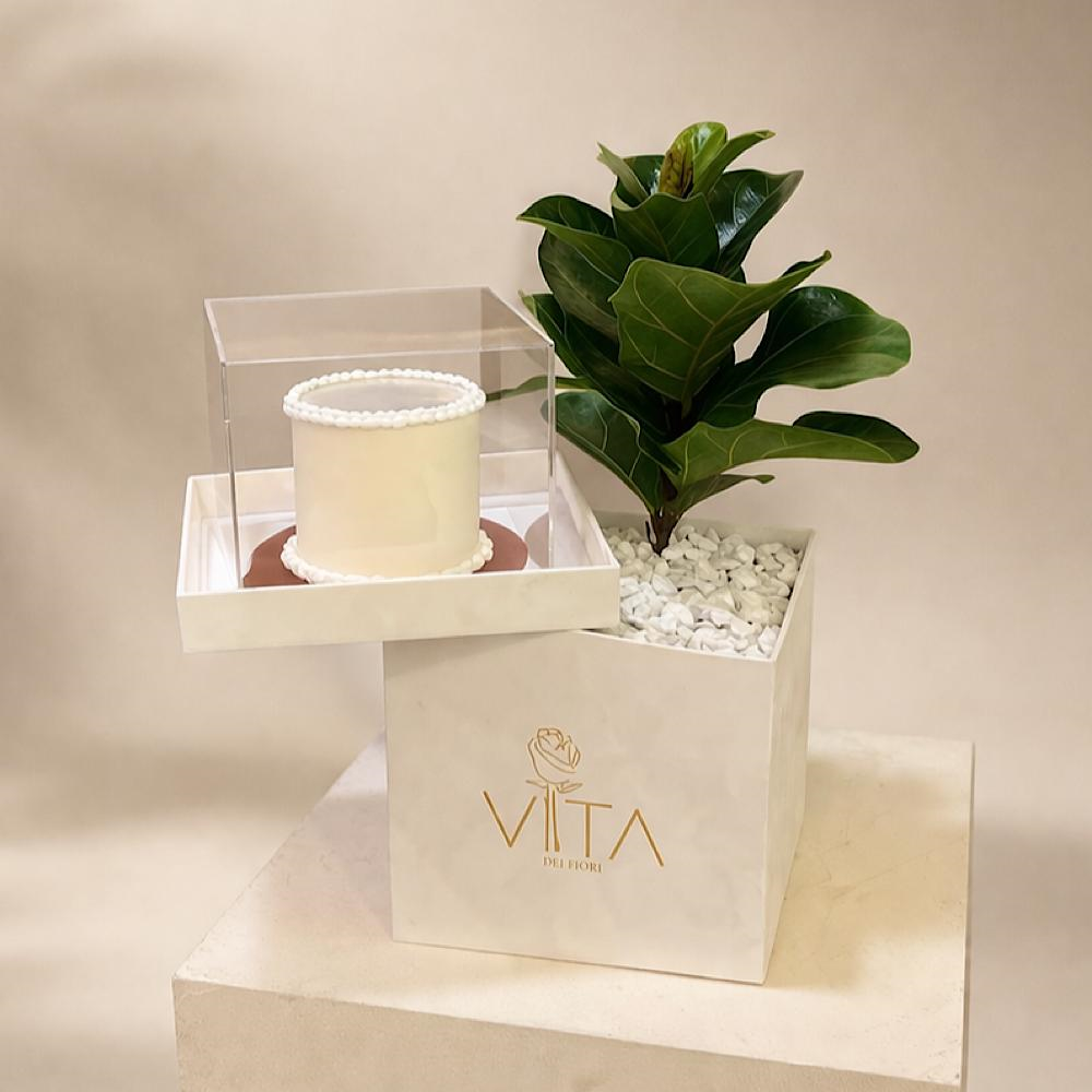 This white box contains a fiddle leaf fig plant, arranged beautifully in a box with a cake.