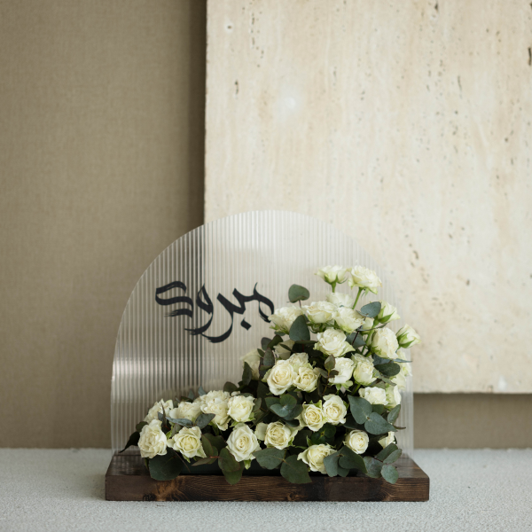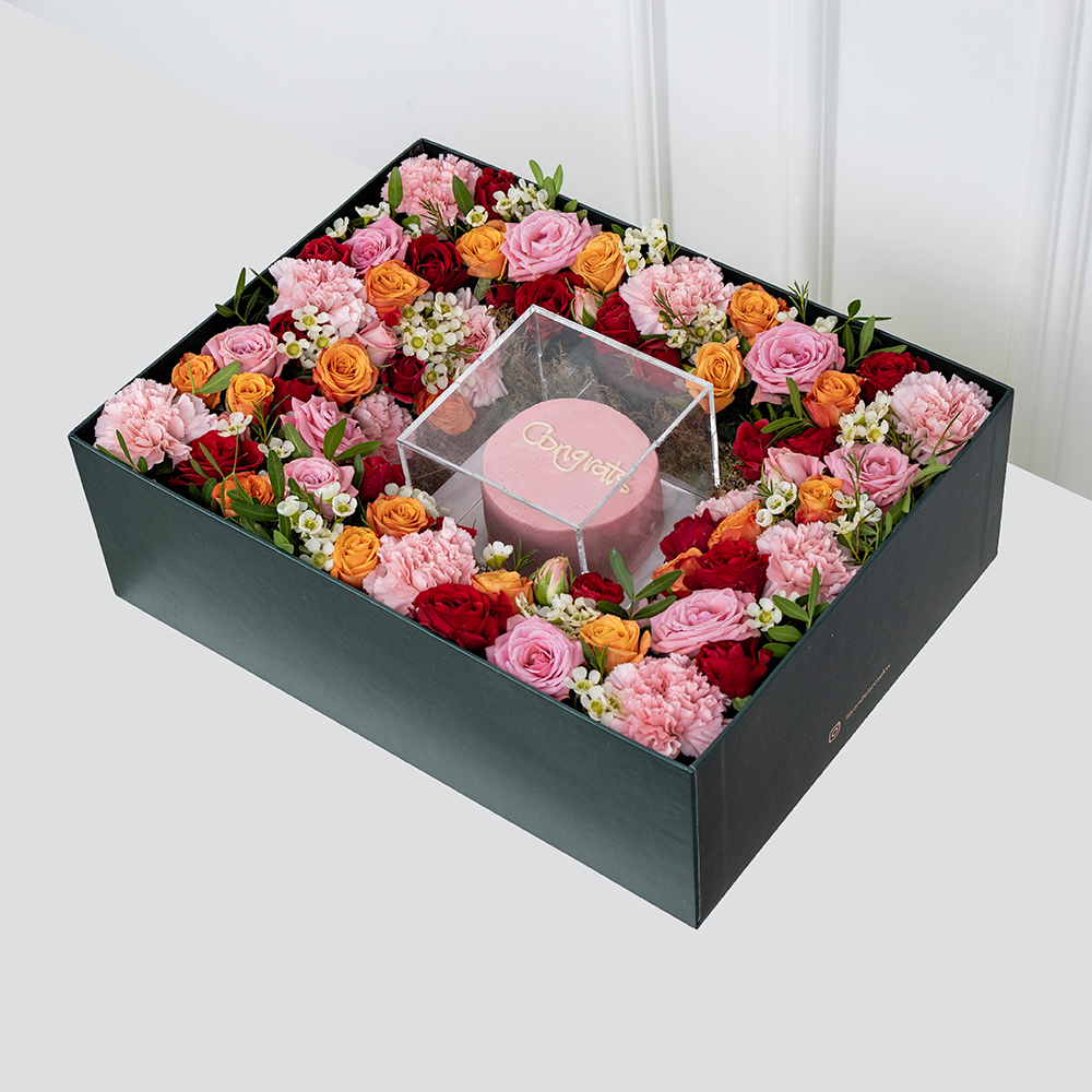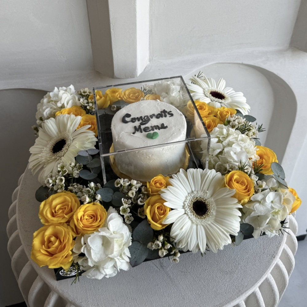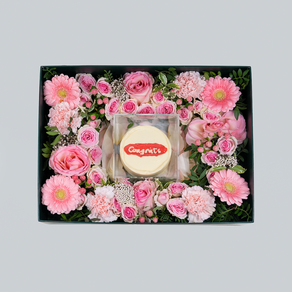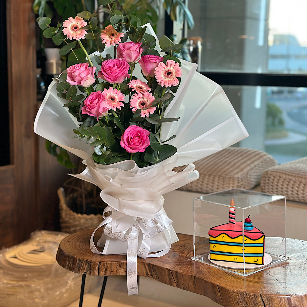 Hand bouquet contains pink grabera pink roses with white wrapping with cake.