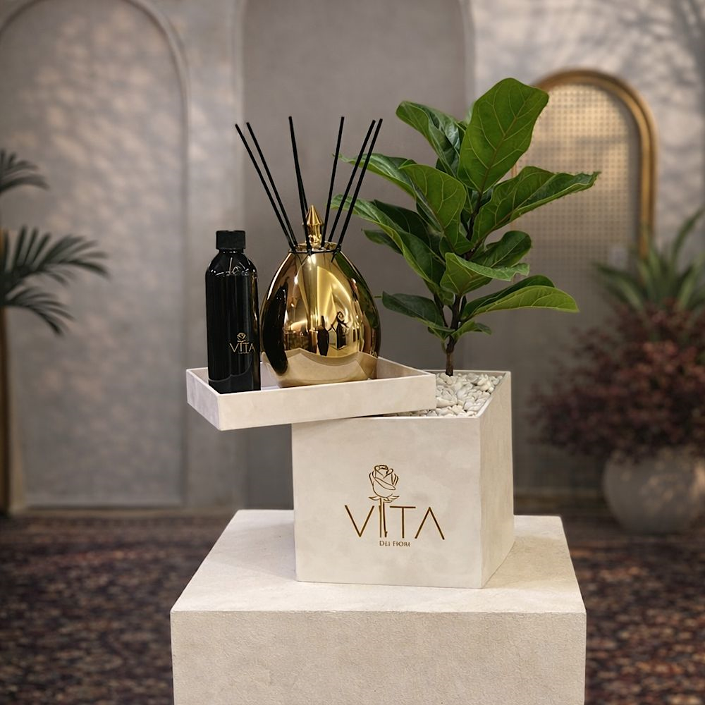 This white box contains a fiddle leaf fig plant, a 250ml diffuser, a "Scandal "perfume oil, and a cover.
