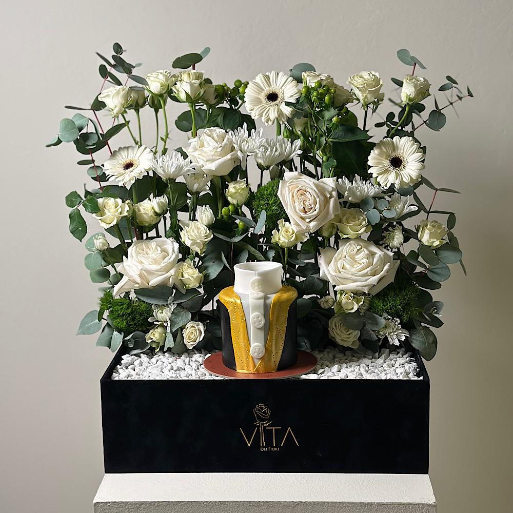 A bouquet containing roses, gerberas, and chrysanthemums, hypericum, arranged beautifully in a box with a bisht-shaped cake.