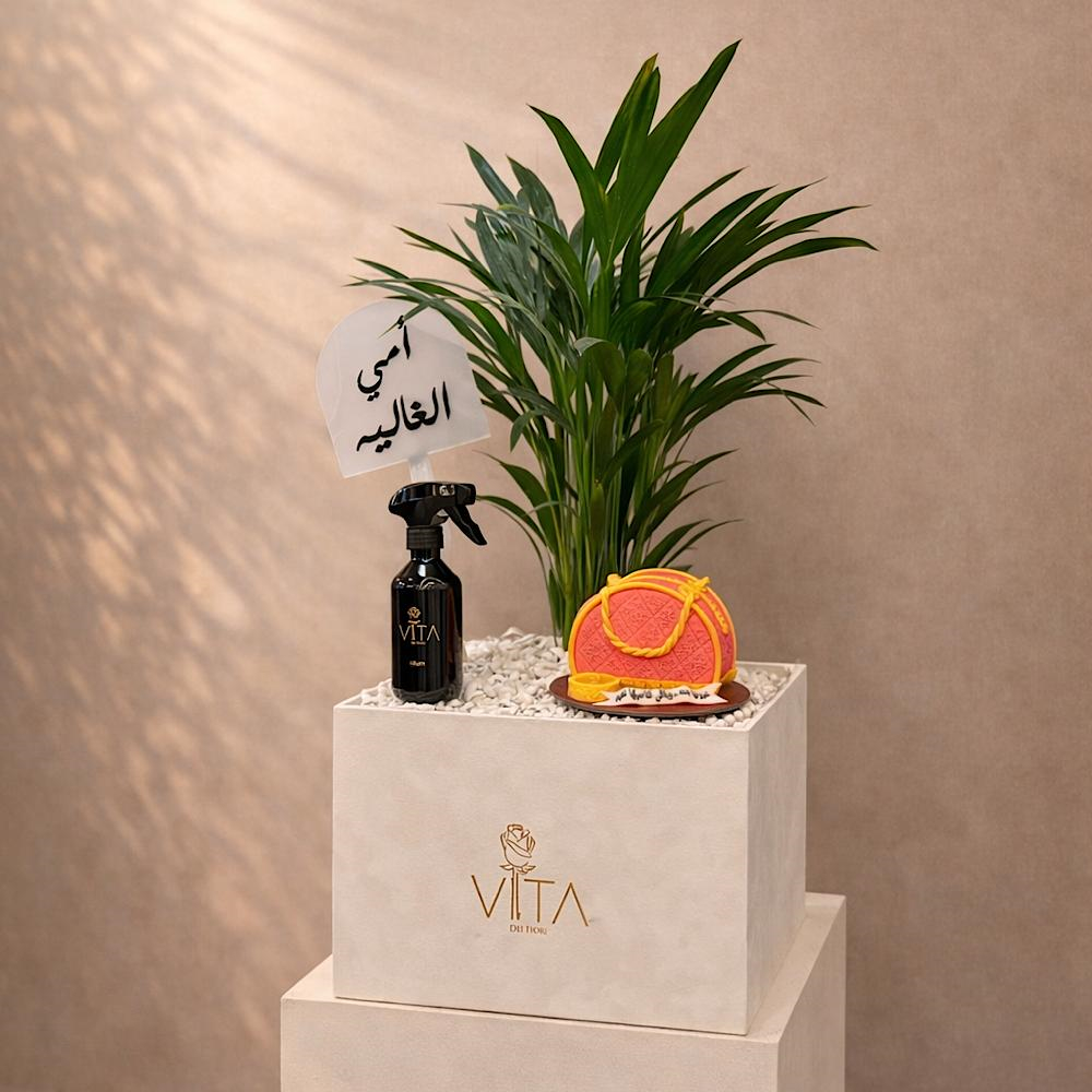 A box featuring palm, home fragrance and a cake with a topper.