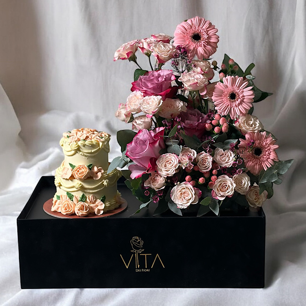 A black box contains deep purple roses, gerberas, pink and baby roses pink, wax flower purple hypericum pink and eucalyptus leaves. comes with a two layered cake.