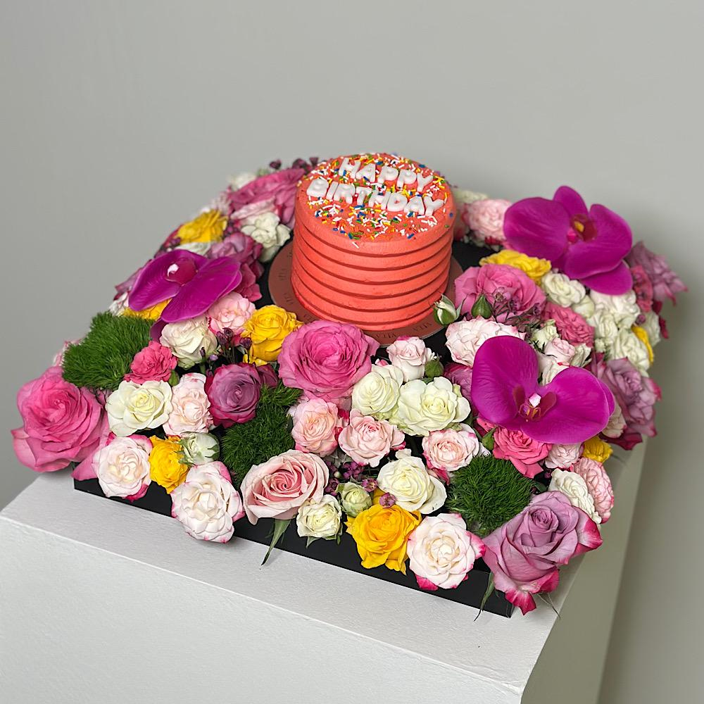 A black base that contains deep purple roses, yellow roses, pink roses, green stick, cut flowers , baby roses and leaves, comes with a cake