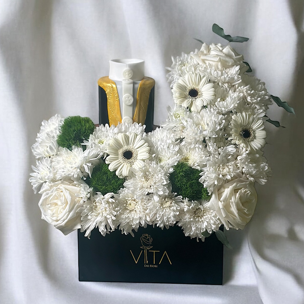 A bouquet containing roses, gerberas, and chrysanthemums, arranged beautifully in a box with a bisht shaped cake.