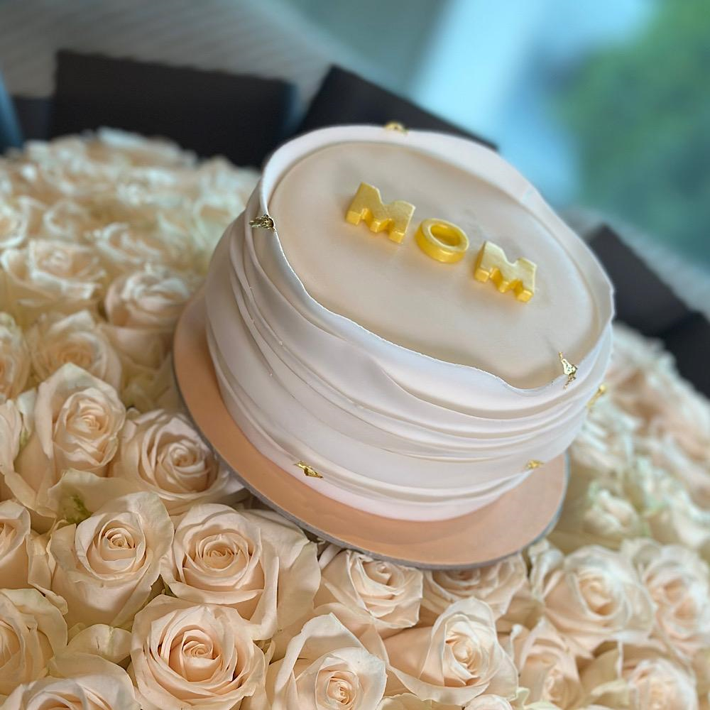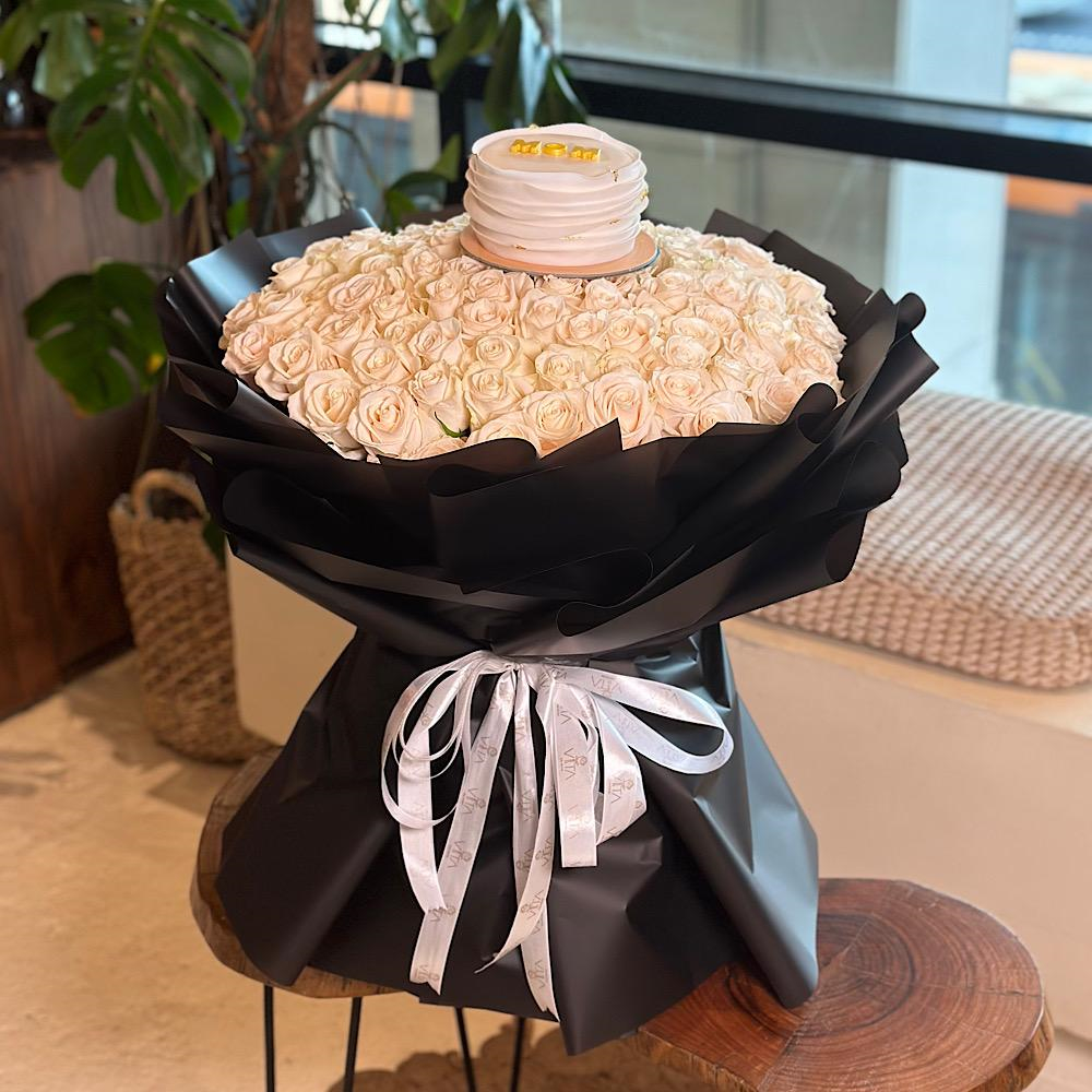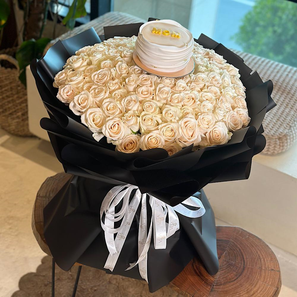 Hand bouquet contains 100 white roses with Mother's Day cake.