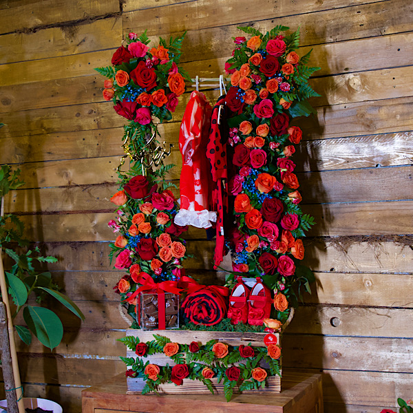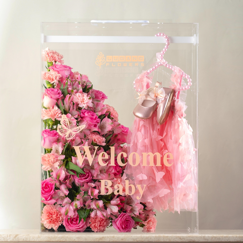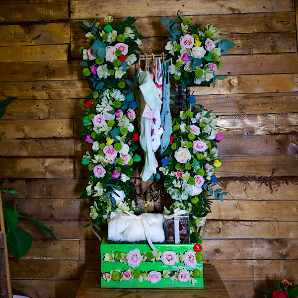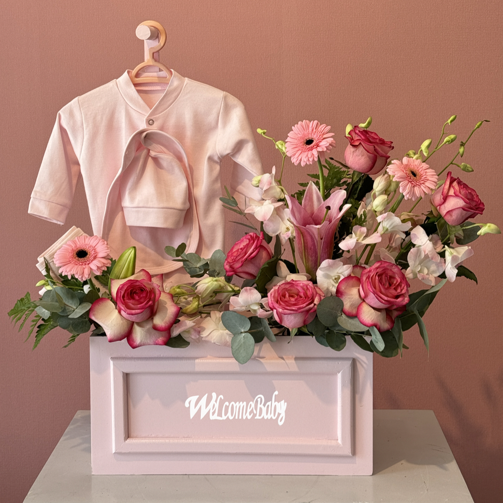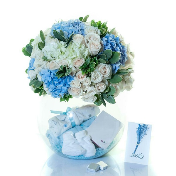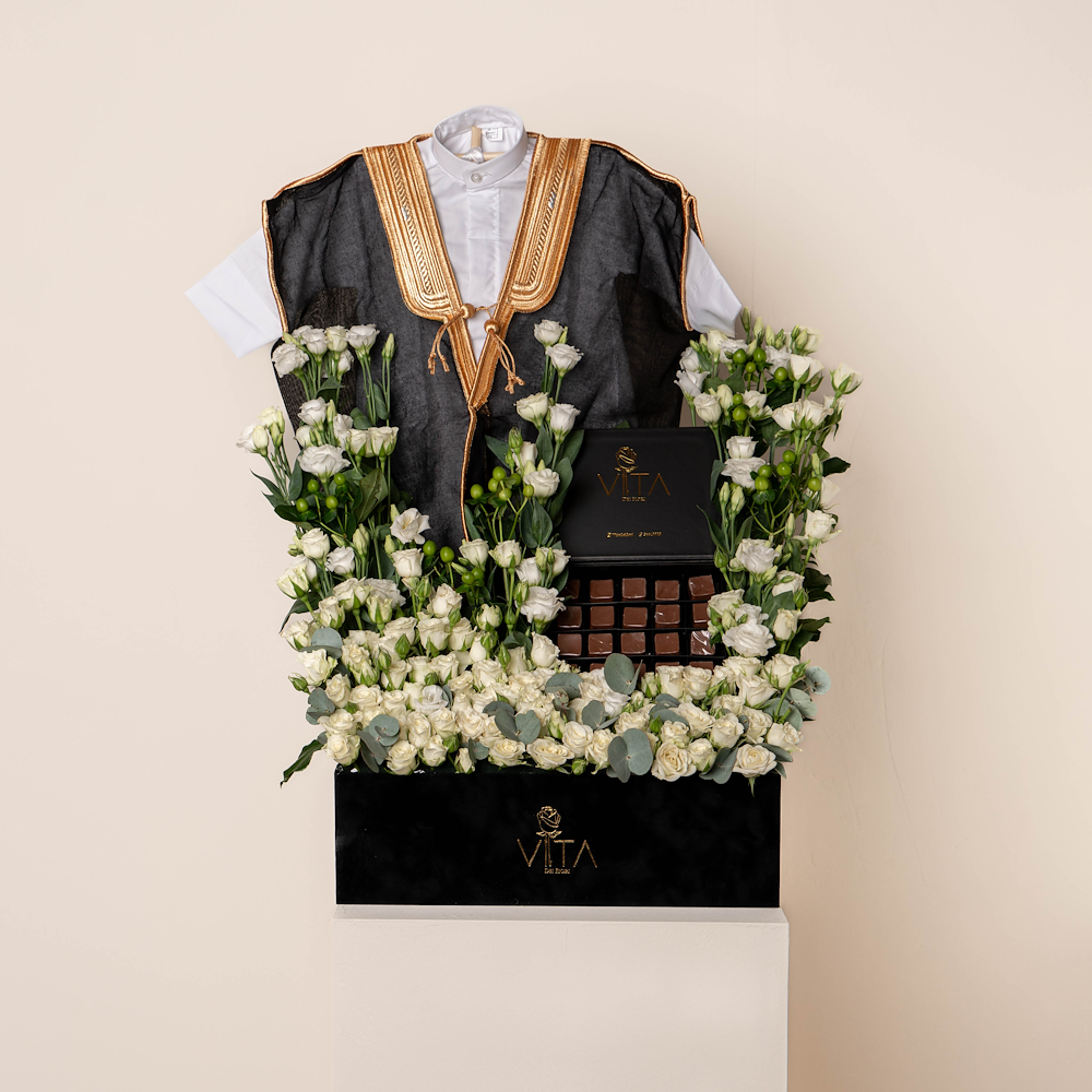 A black box contains white baby roses, green leaves and green hypericum with a box of chocolates, new baby born dishdasha and bisht.