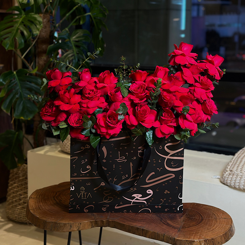 Black bag with Arabic letter design contains red roses.