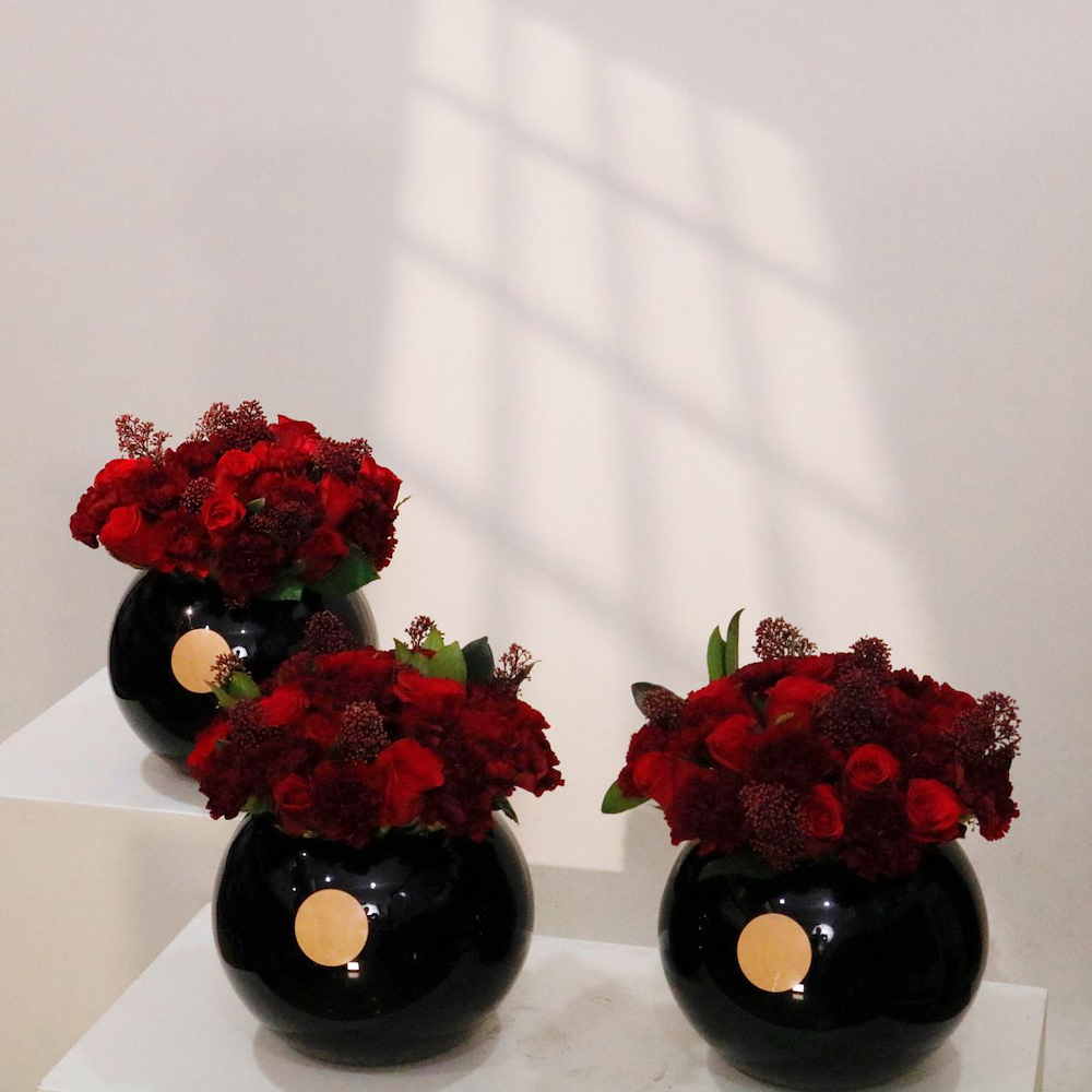 A distinctive set of 3 black vases sparkling with velvety red roses. An elegant design that highlights the natural beauty of exquisite flowers with a touch of sophistication.