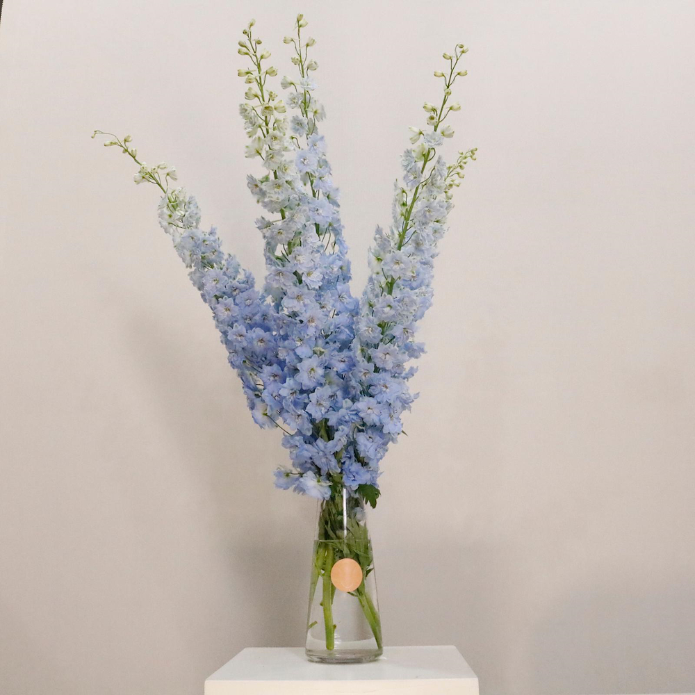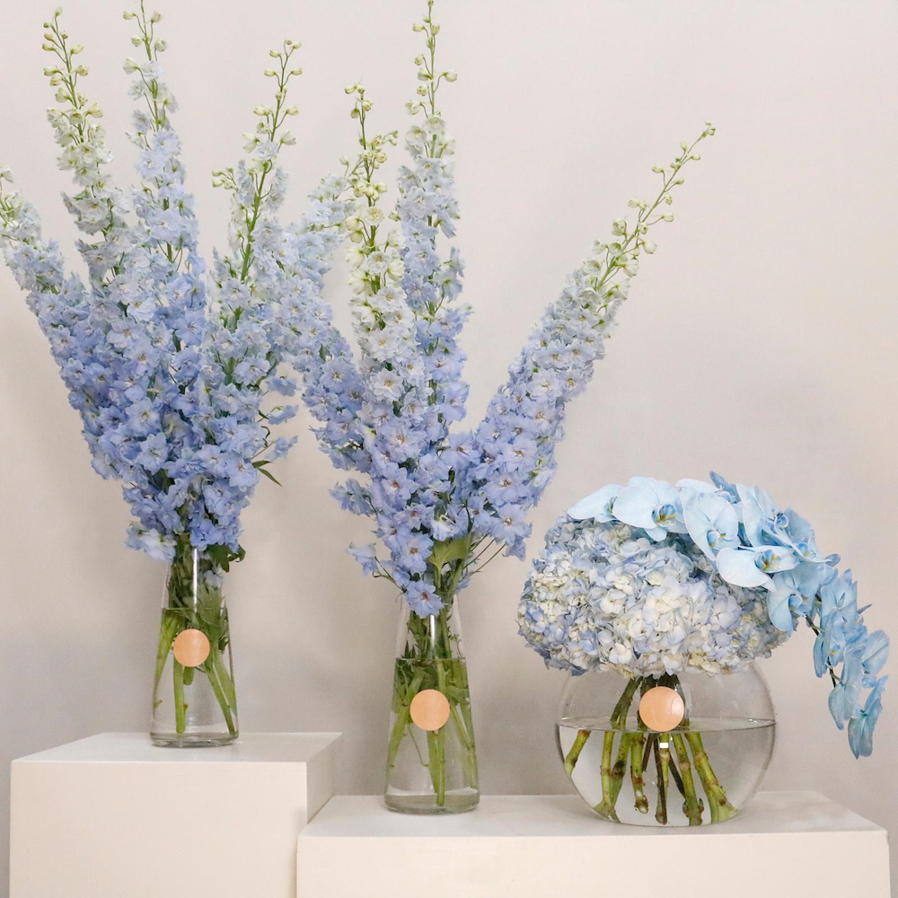 An elegant set of 3 floral arrangements in soft blue tones, featuring delphinium, blue hydrangeas, and delicate orchids in clear glass vases. Perfect for receptions, luxury home décor, events, and refined gifting, adding a calm and timeless touch to any space.