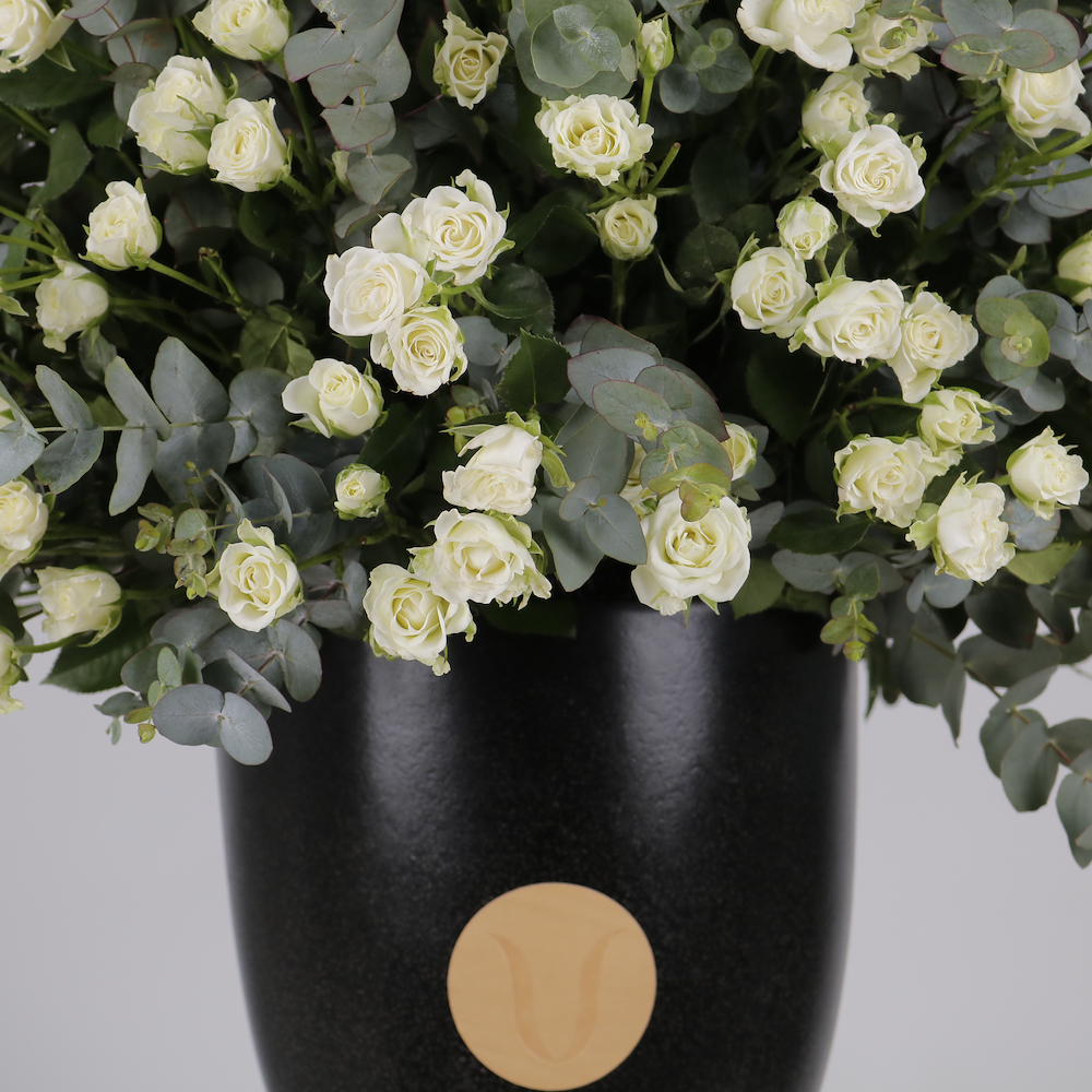 An elegant arrangement of white spray roses with fresh eucalyptus in a sleek black vase. Soft, timeless, and effortlessly refined.