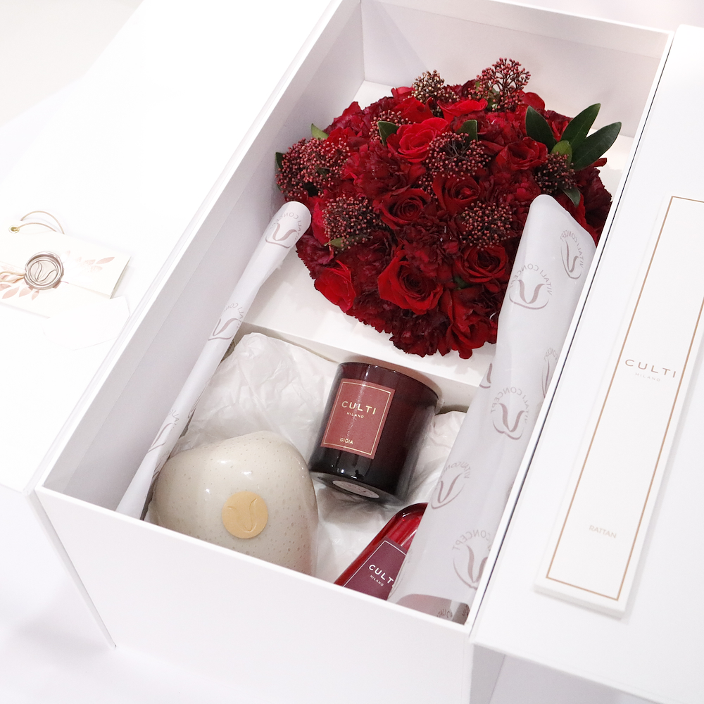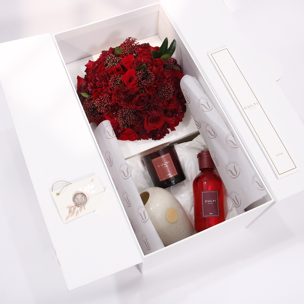 An elegant gift set featuring a red roses, a handcrafted vase, paired with a Culti Milano diffuser and a Goia scented candle.