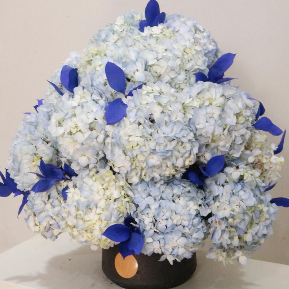 Elegant blue hydrangeas with royal blue accents, inspired by the beauty of the blue butterfly.
