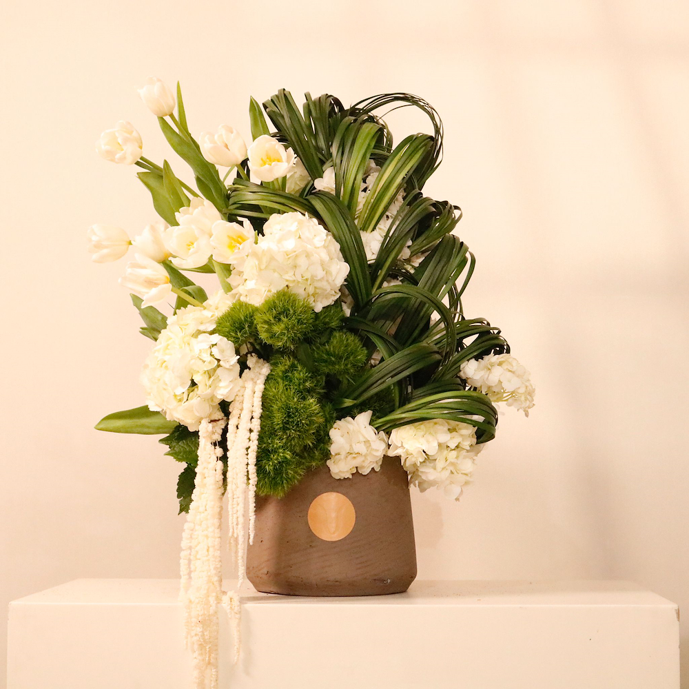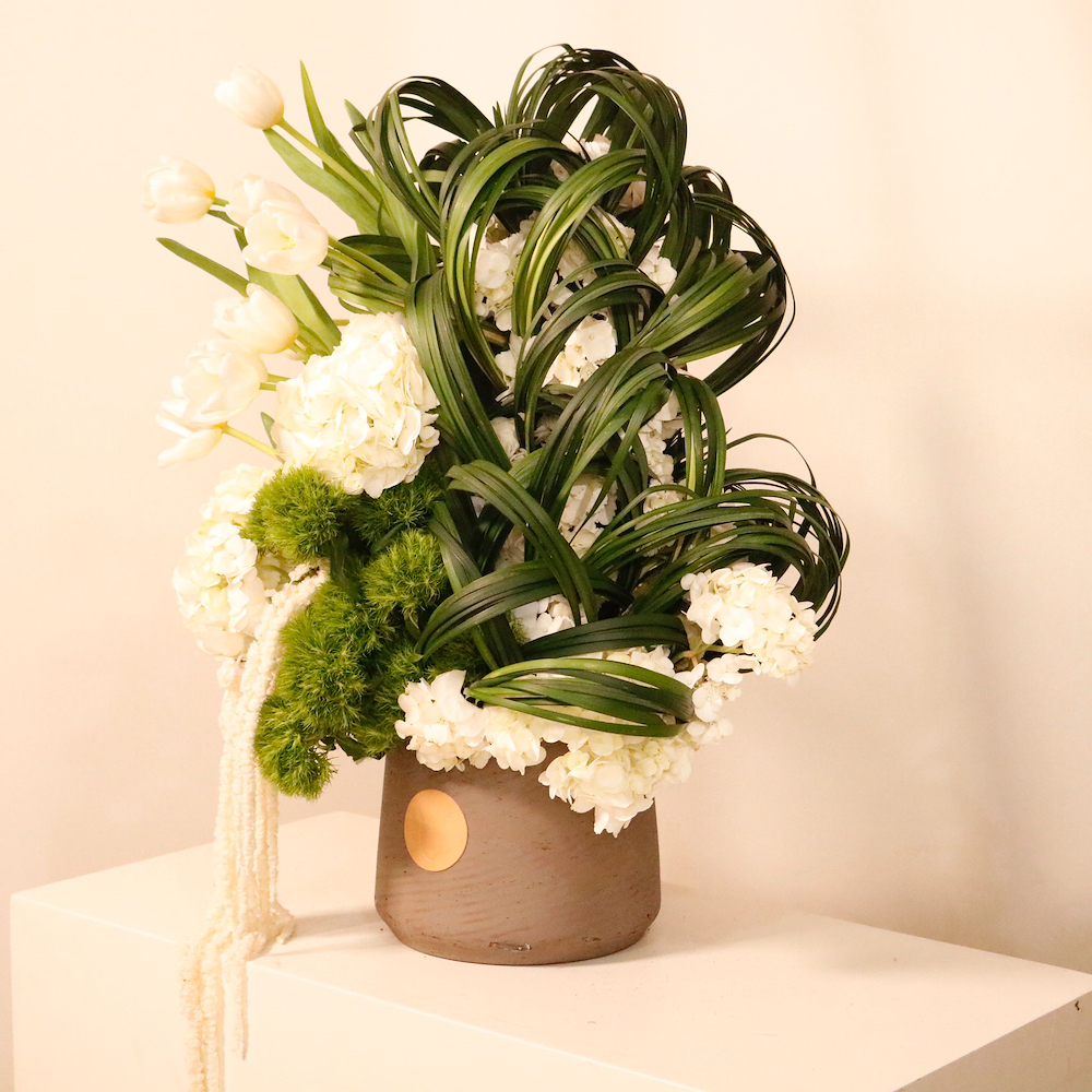 A lush, architectural composition of white tulips and hydrangeas accented by cascading greenery and sculptural foliage in a modern stone-toned vase.