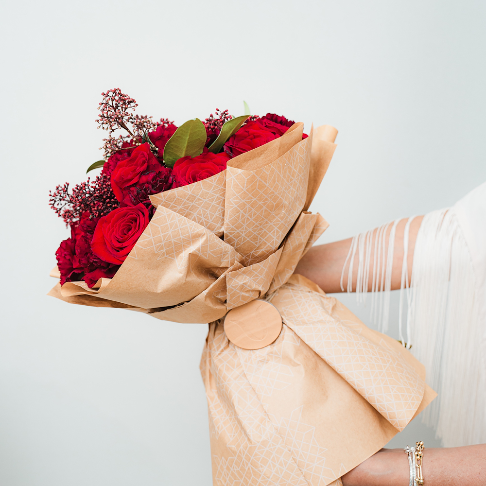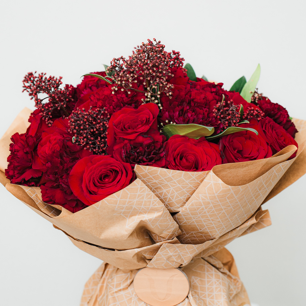 A hand bouquet that contains roses, carnations and skimmias.