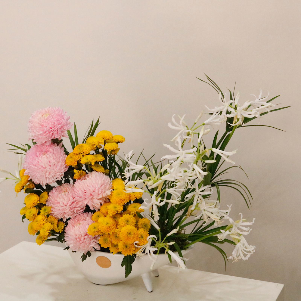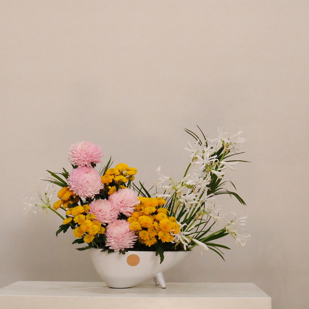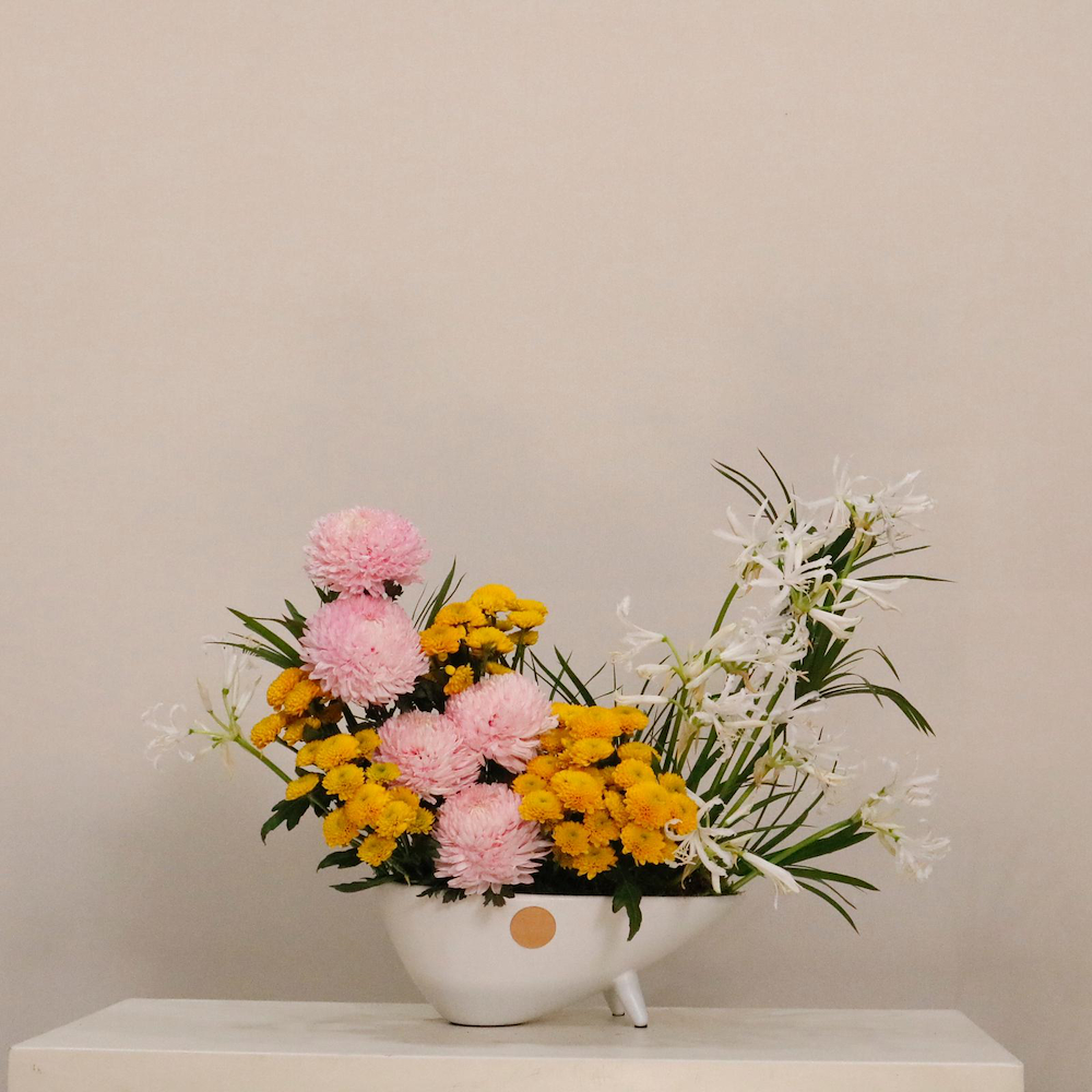 A delicate blend of pink, yellow, and white chrysanthemums, designed to brighten any space with effortless elegance.