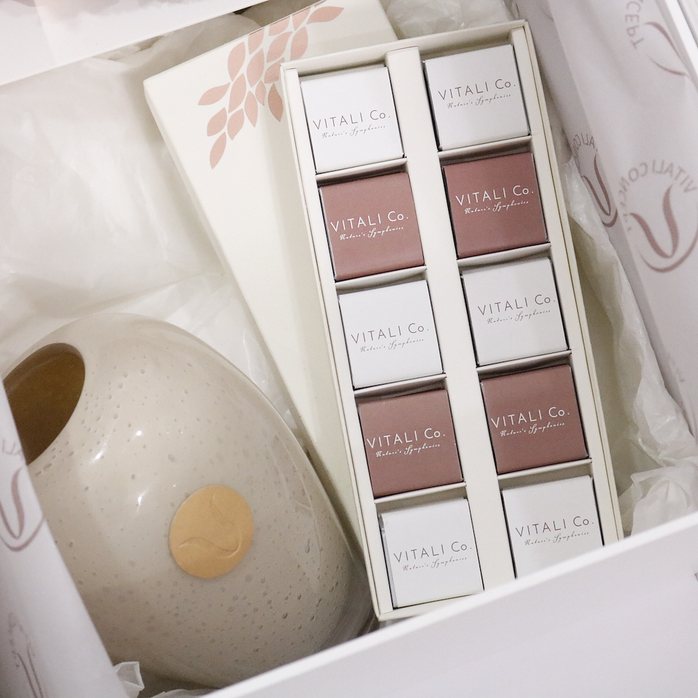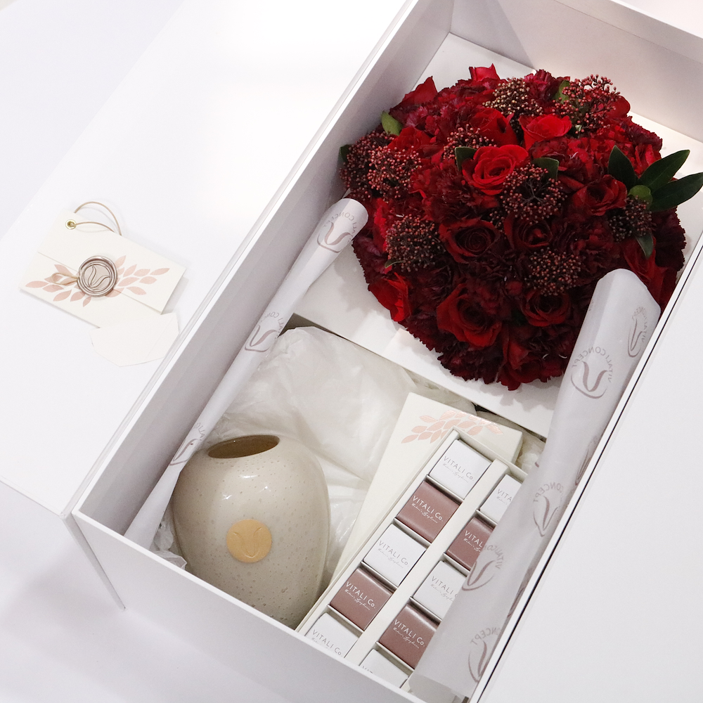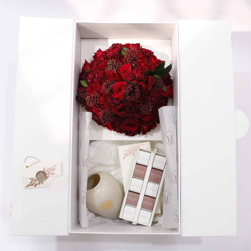 A luxurious gift set featuring premium roses and carnations, artisan chocolates, and a handcrafted vase. An elegant designer choice for any occasion.