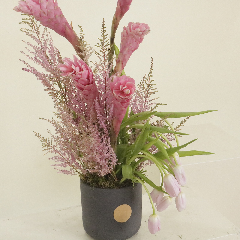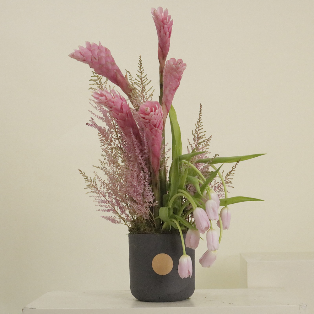 A graceful arrangement featuring soft pink ginger blooms and delicate tulips, styled in a modern charcoal vase. Designed to bring calm elegance and understated luxury to any space.