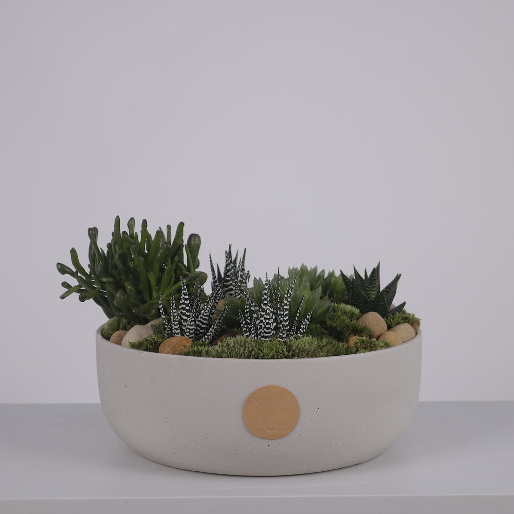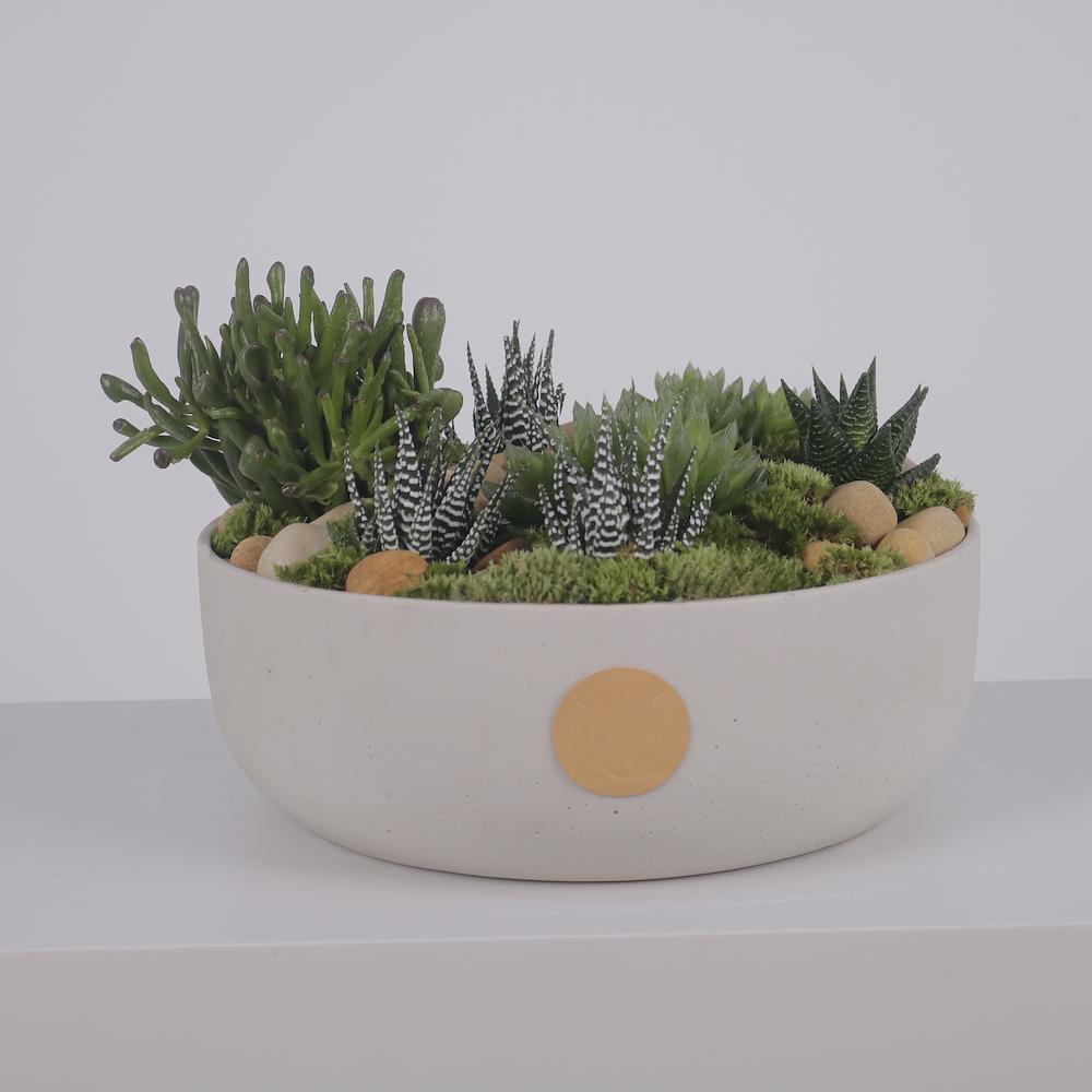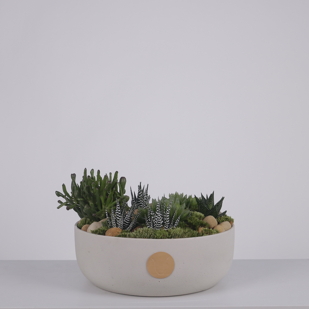 A lush, living landscape of premium architectural succulents and natural river stones in a minimalist ceramic bowl. A sophisticated, low-maintenance that brings timeless organic beauty to any home or office.