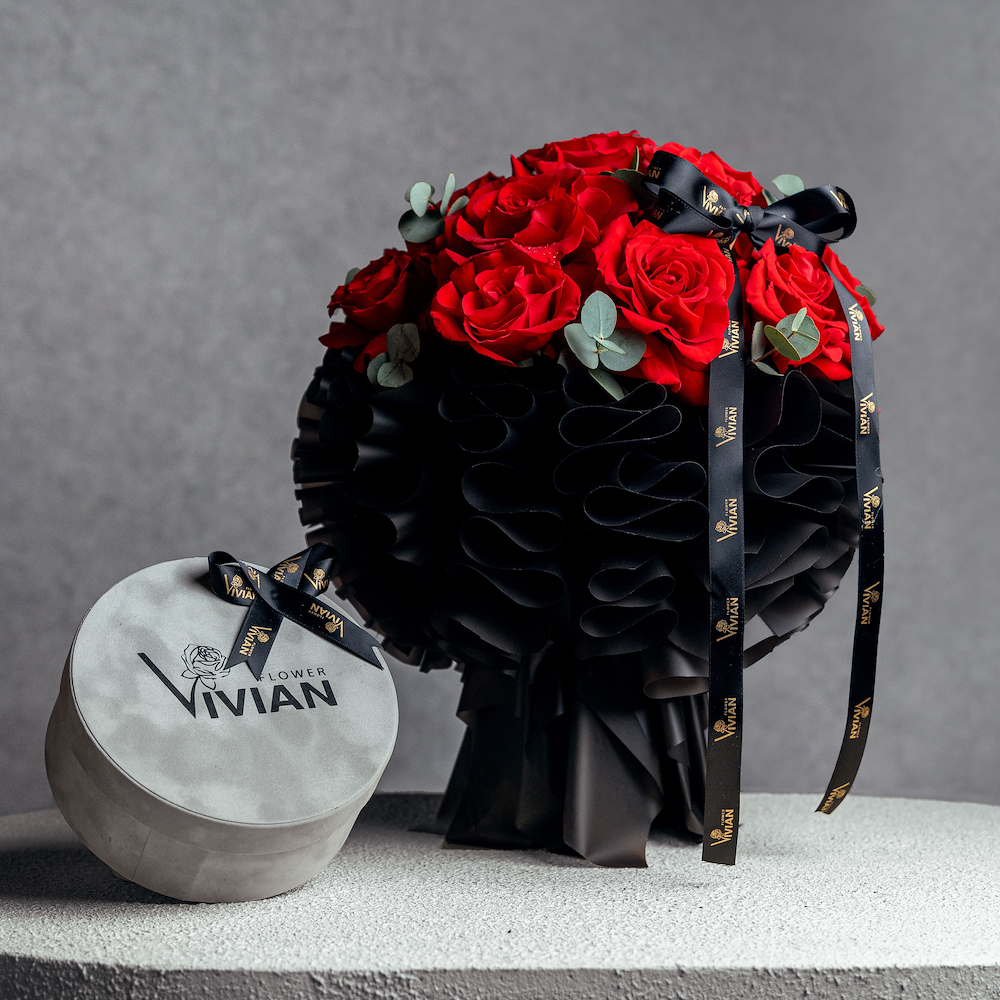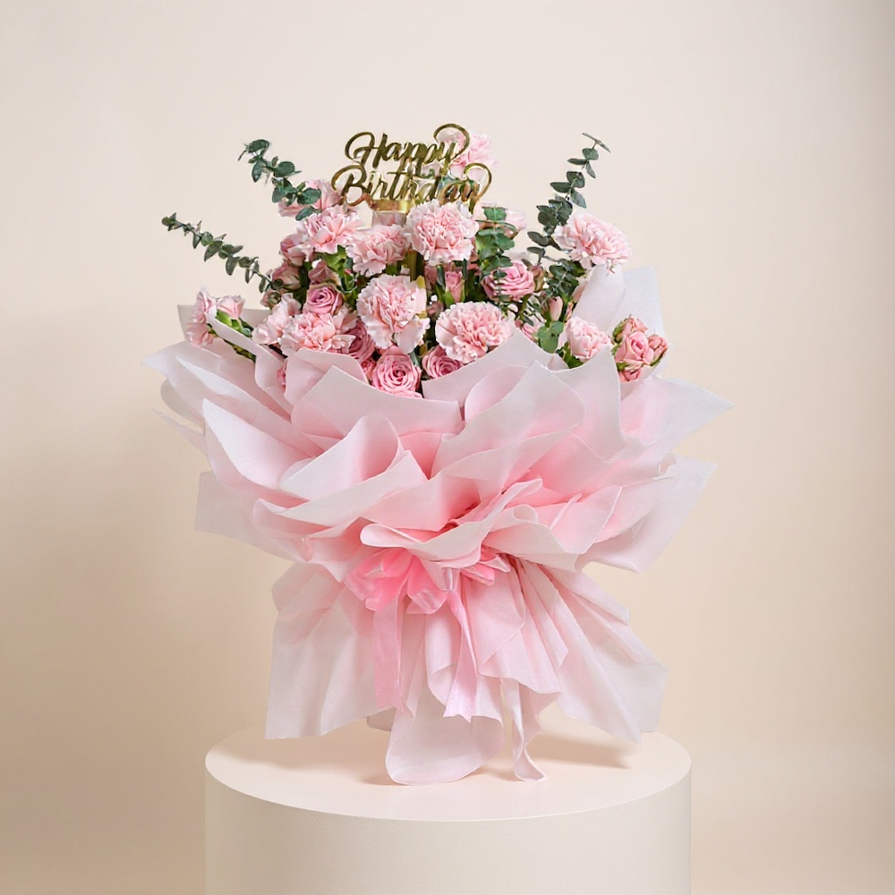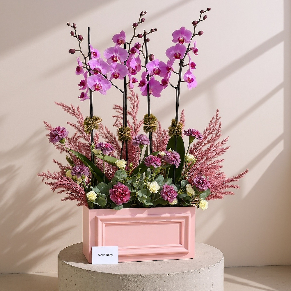 A tiered bouquet of purple orchid plants and carnations, elegantly arranged in a pink box, and decorated with eucalyptus leaves for a fresh and beautiful touch.