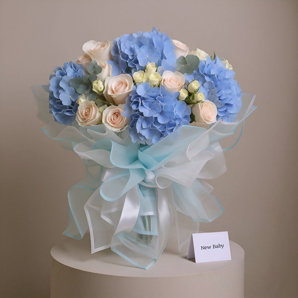 A bouquet in distinctive packaging, containing blue hydrangeas and white roses, with cineraria leaves.