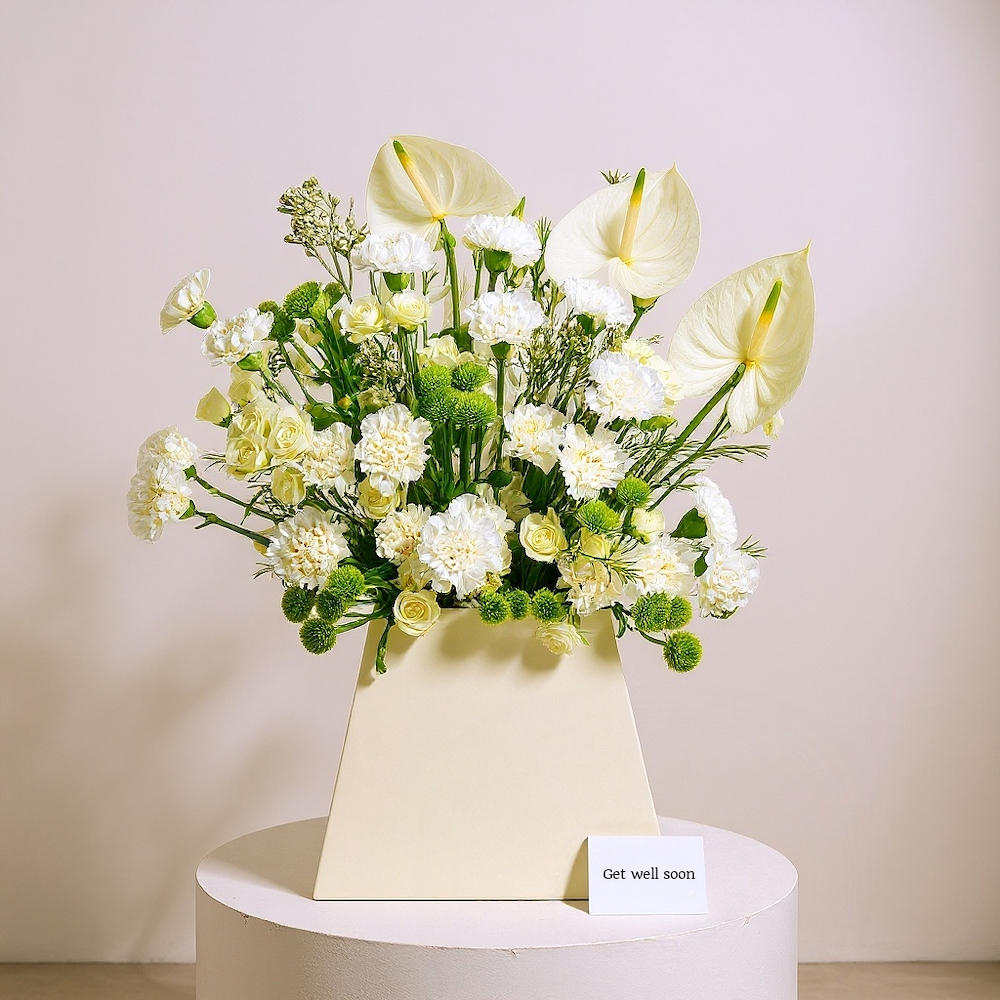 A stand that contains carnations, roses, anthuriums and chrysanthemums.