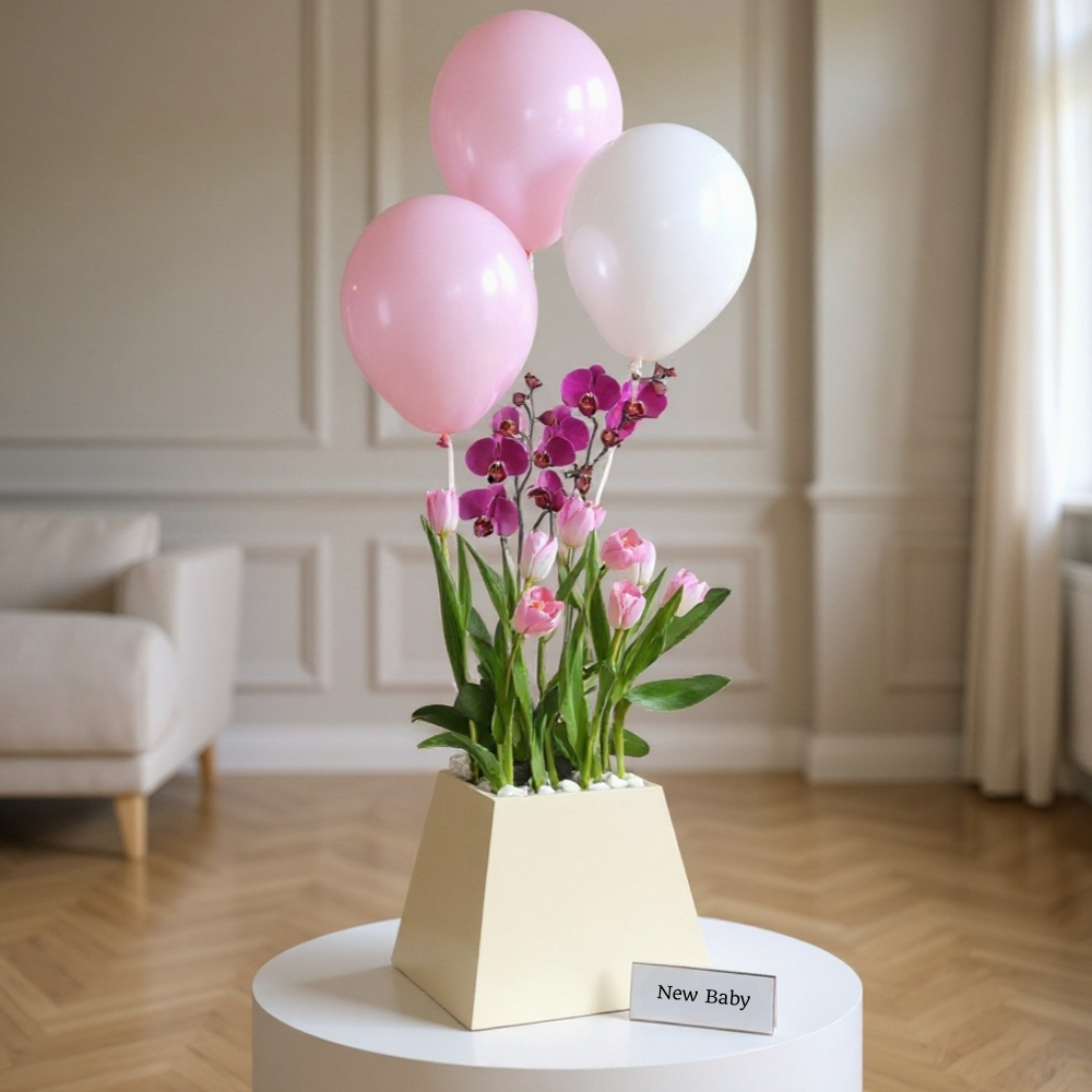 A box containing pink tulip flowers and purple orchid plants with balloons. A gift that adds a beautiful touch of joy.