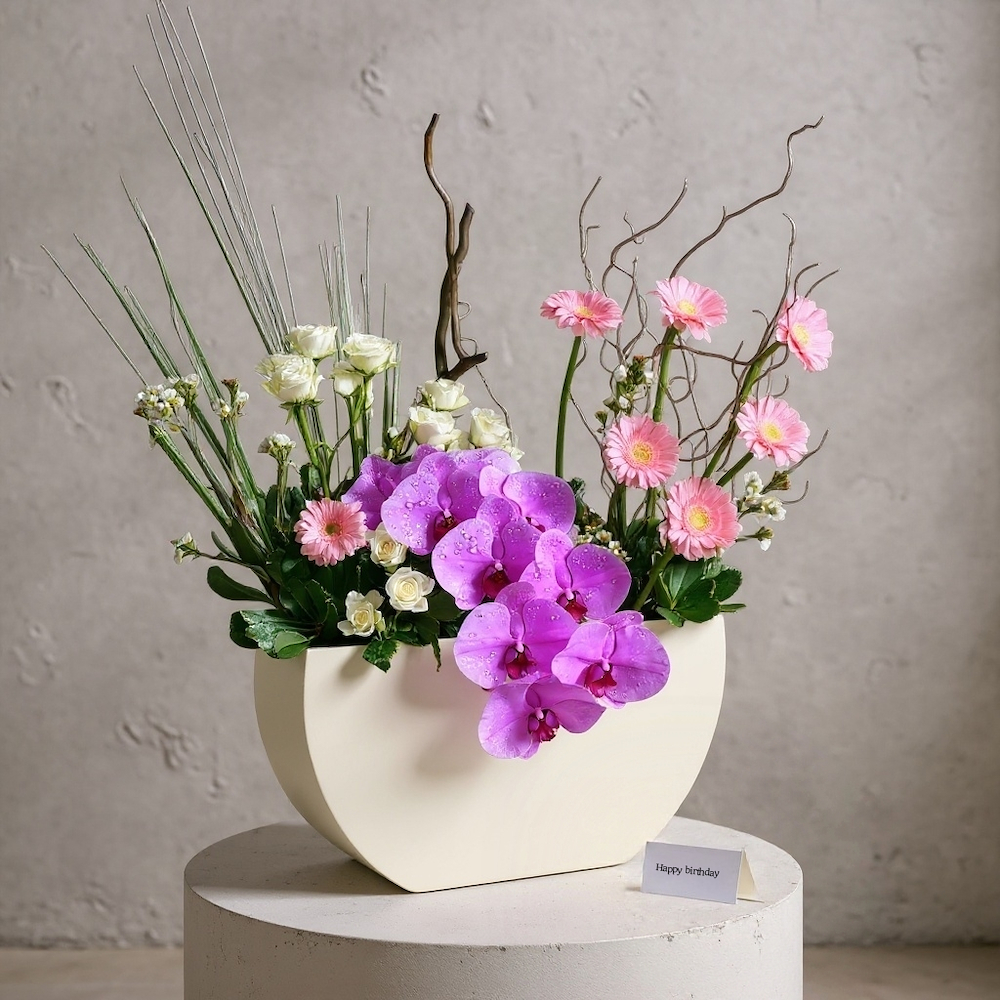 A bouquet containing baby roses, orchids, and gerberas with their unique secret. A gift that adds a touch of beauty.