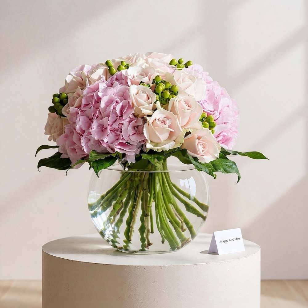 A beautiful vase with roses and hydrangea flowers in the shape of a bridal bouquet. A valuable gift to share the joy.