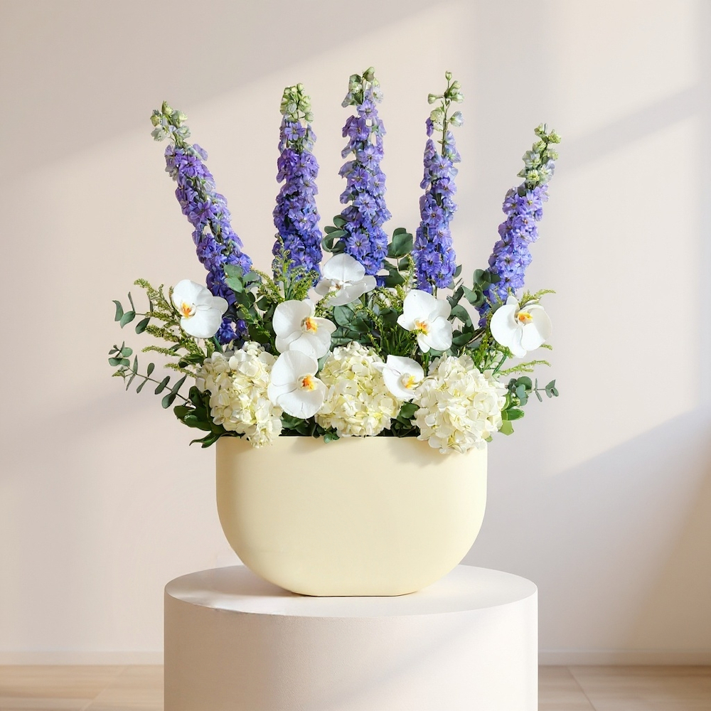 A box arranged with purple delphiniums, hydrangeas, and orchids.