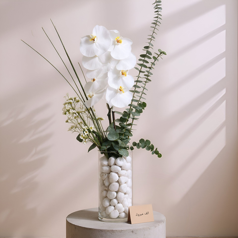 A vase arranged with white orchids and wax flowers, surrounded by eucalyptus leaves.
