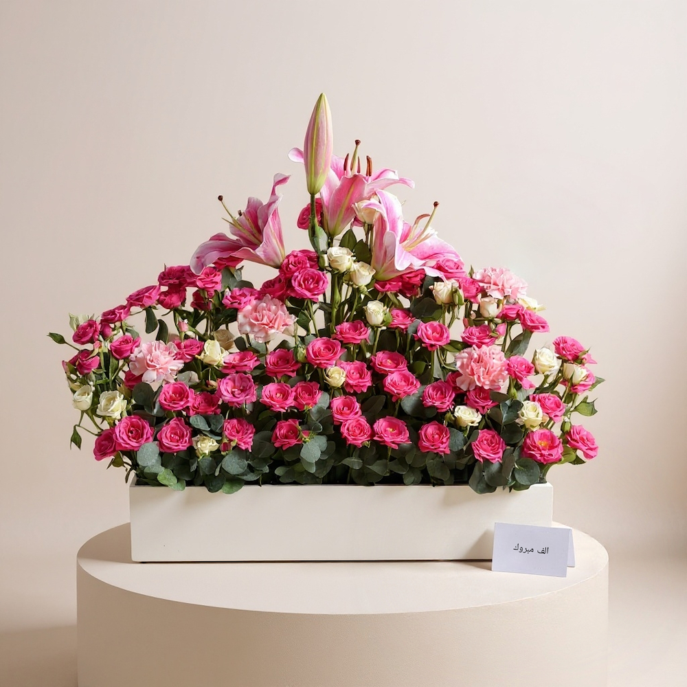 A box filled with colorful baby roses, carnations, and fragrant casablanca, a precious gift to share the joy.