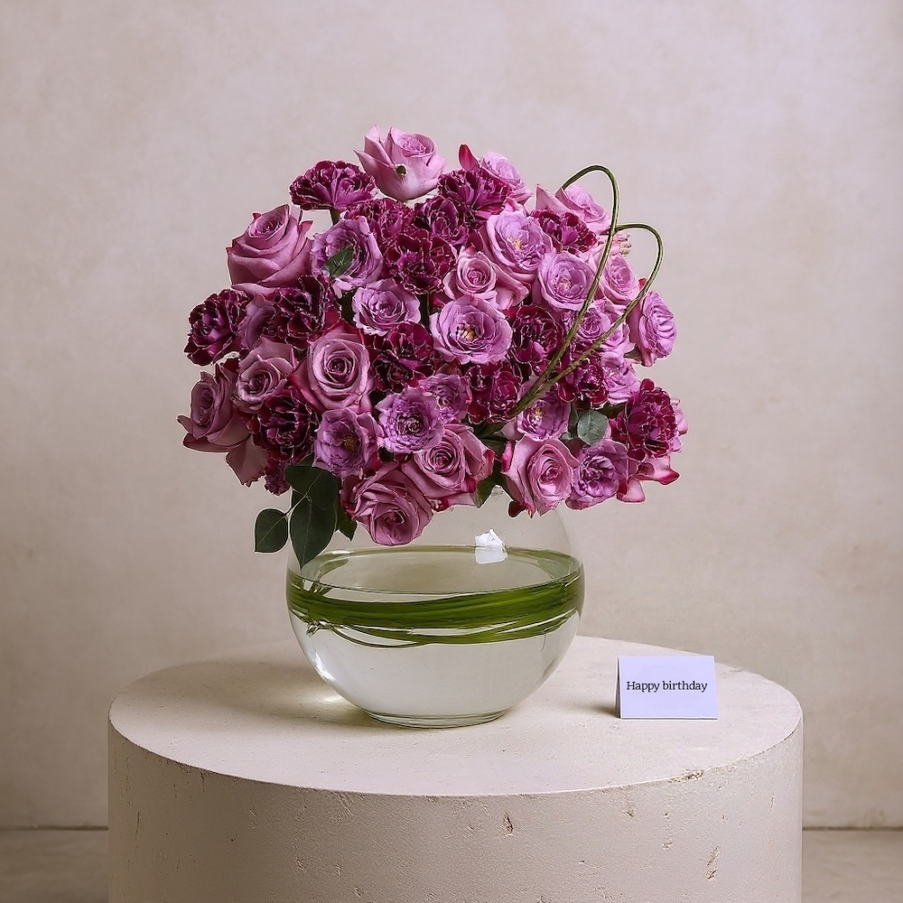 A gorgeous vase beautifully arranged with purple carnations and roses.