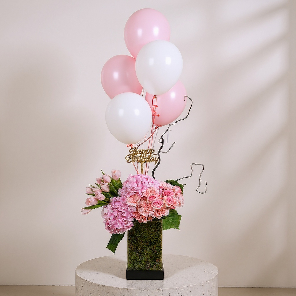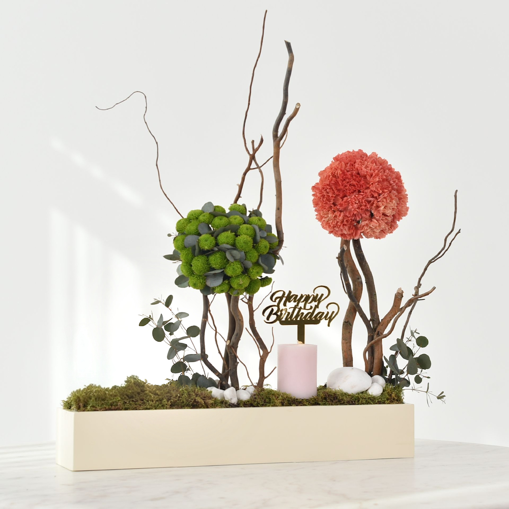 A box containing a distinctive arrangement of carnations and chrysanthemums, presented with a candle.