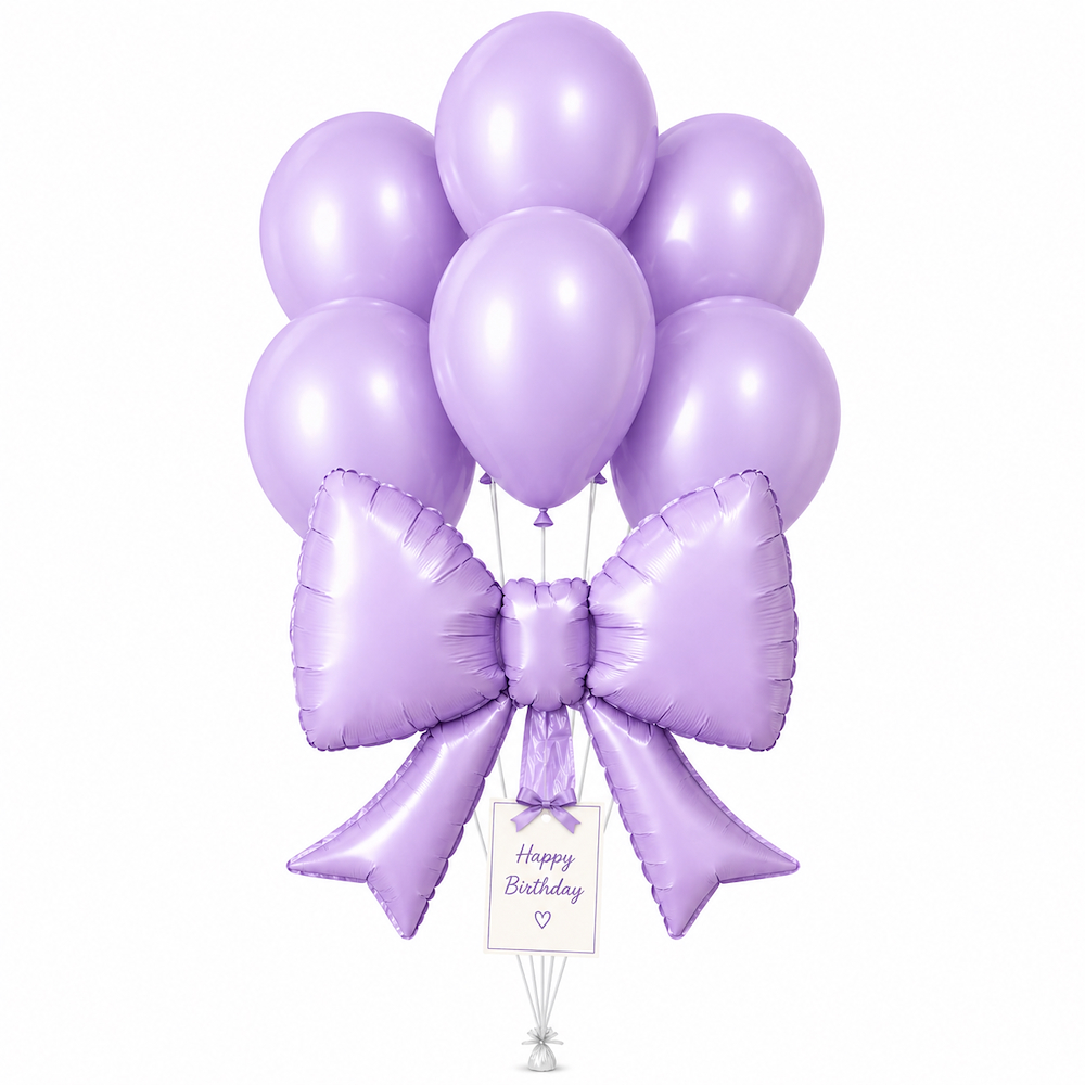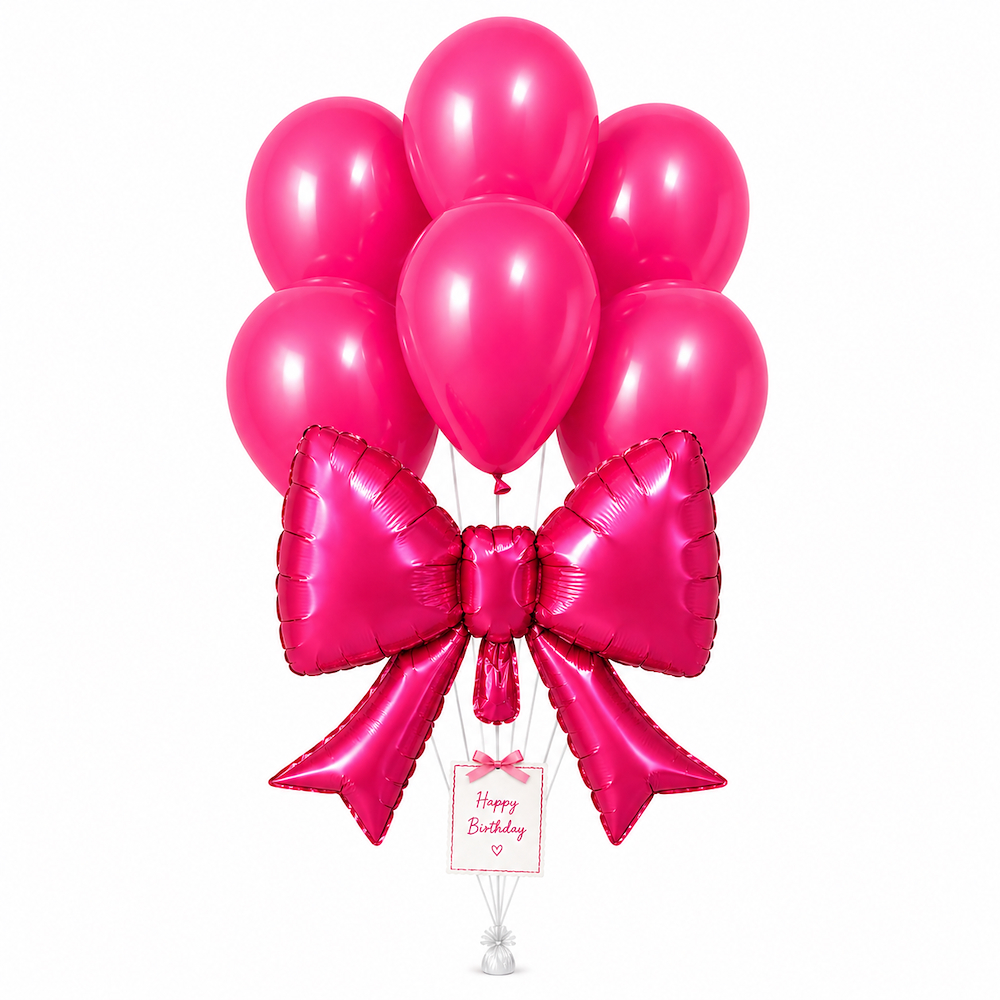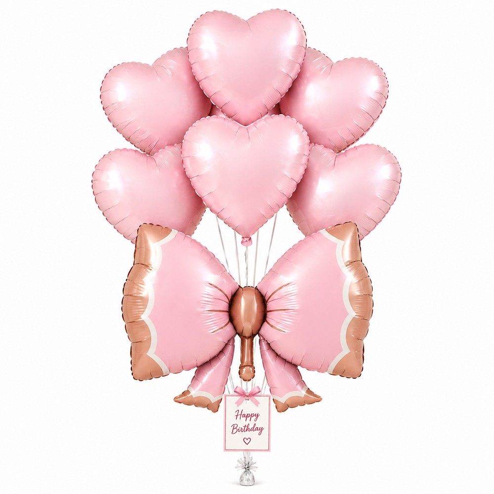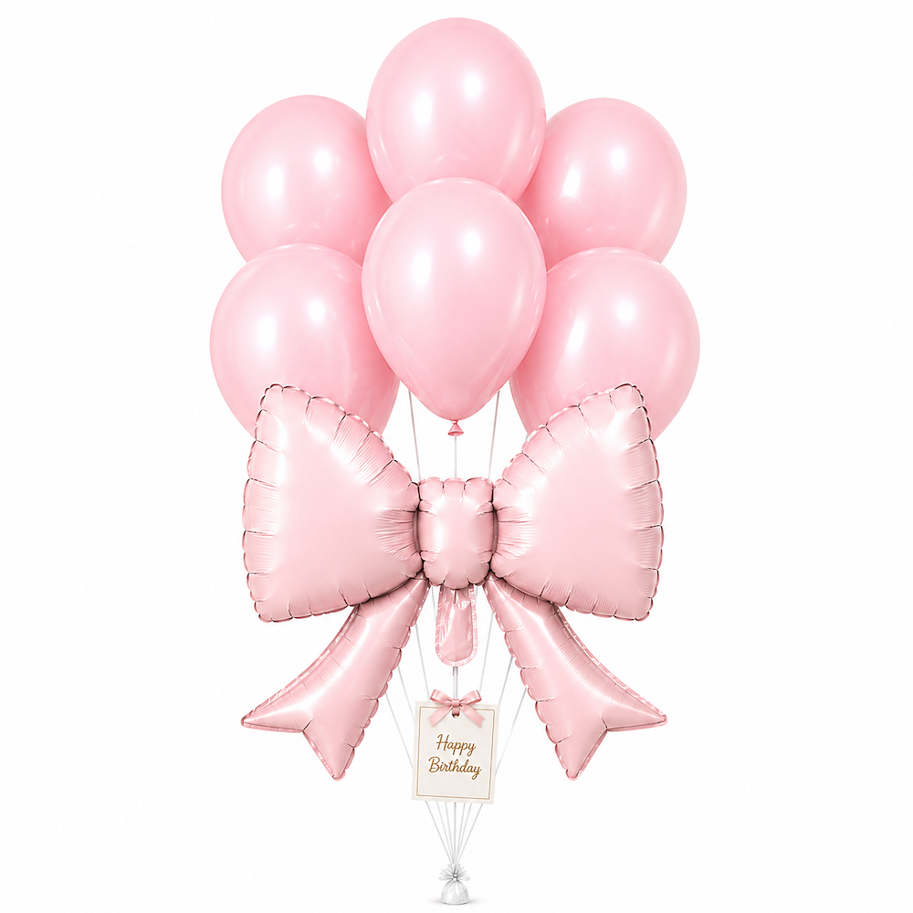 A balloon arrangement featuring a large 58×92 cm bow-shaped foil balloon, complemented by 6 8-inch balloons. Designed in soft pink tones, it creates a sweet and elegant display. Perfect for birthdays and special celebrations