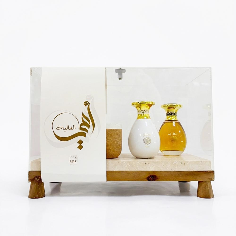 A gift set containing an incense burner, a bukhour box, a 100 ml qatra edp, and a 100 ml qatra white edp.