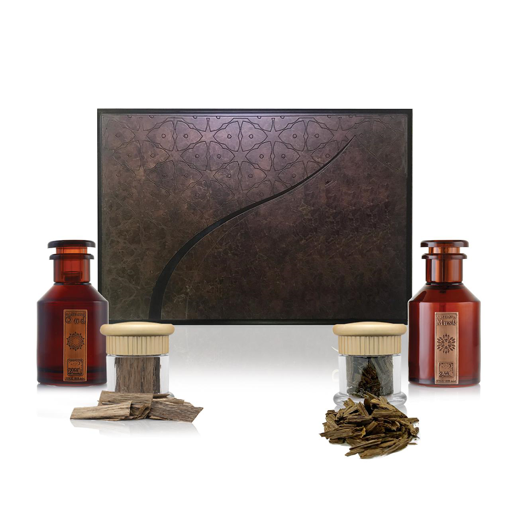 A gift set containing Al-Shaya musk 100 EDP, Al-Shaya oud 100 EDP, daily bokhour 18g, and 1 tola of Indian bokhour.