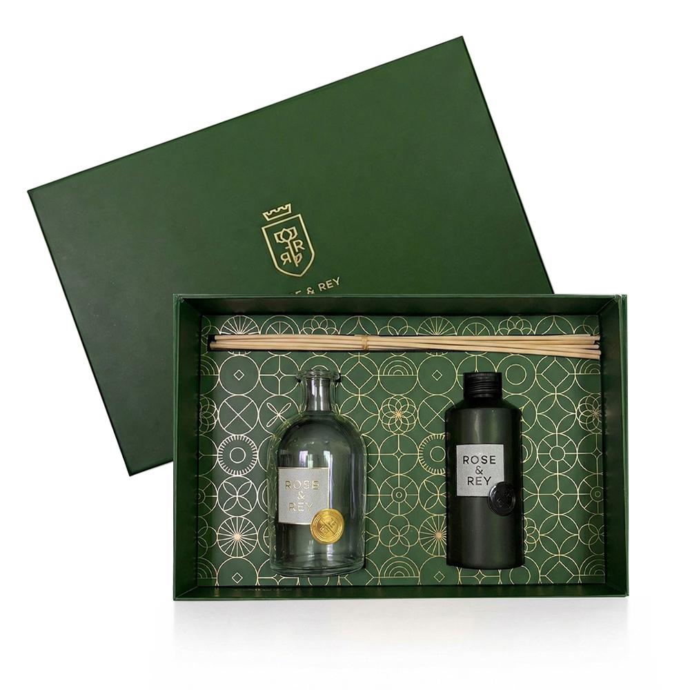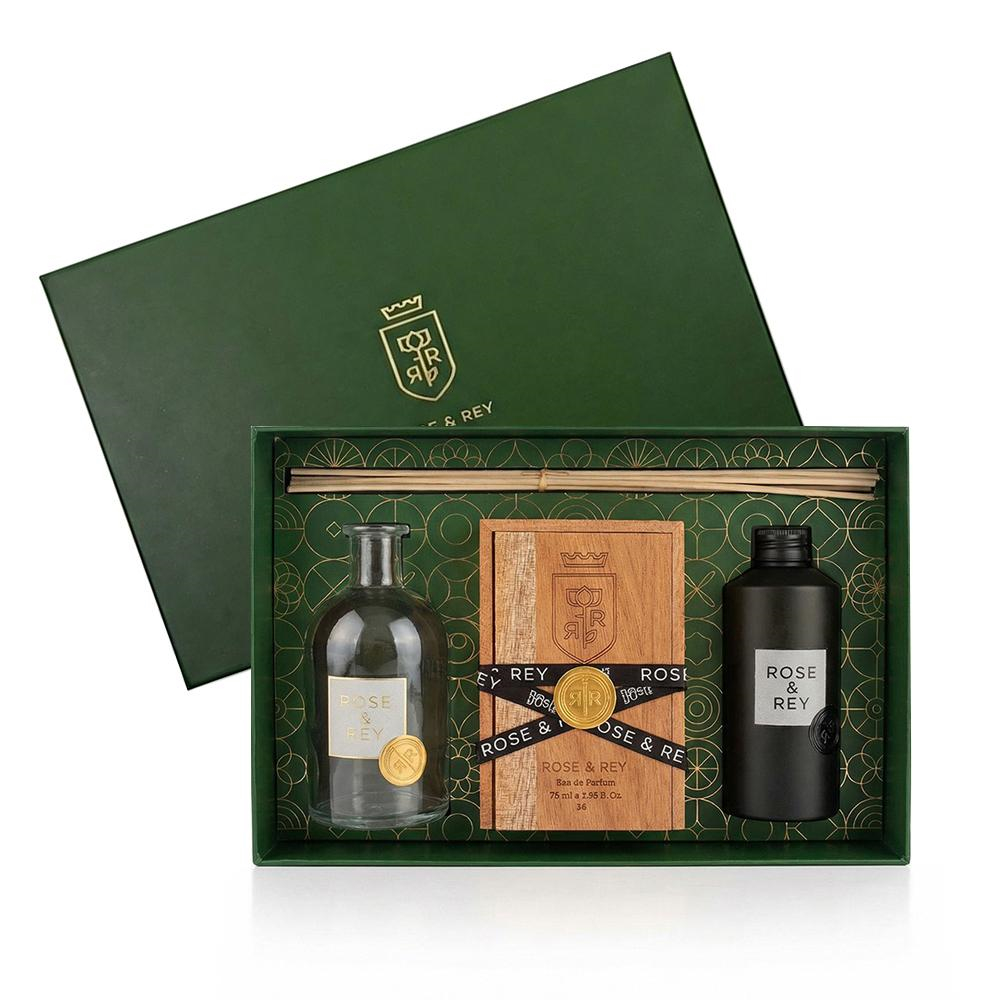 A box that contains a perfume spray, a perfume oil, khaltat, mubkhar, Bakhor mumassak, lighter, coal and tongs.