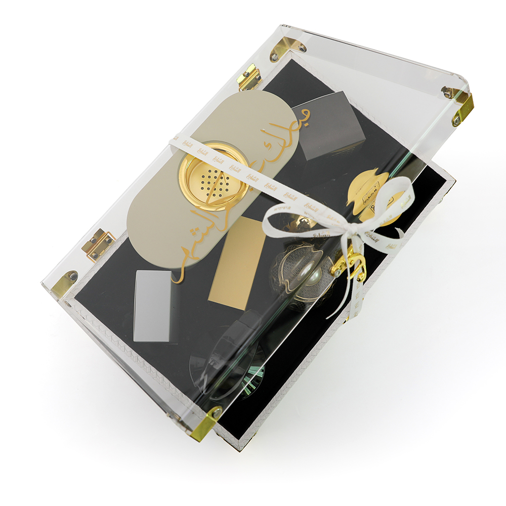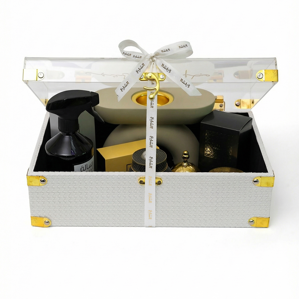 A gift of authentic kuwaiti hospitality, a luxurious and complete gift for the arab home containing premium incense, an elegant incense burner, air freshener, fabric freshener, and authentic amber oil, everything you need to create a sophisticated ramadan atmosphere befitting kuwaiti hospitality, gift contents include anouf perfume 55ml, a luxurious fragrance for men and women, lilas perfume 55ml, a floral oriental fragrance for women, message air freshener 500ml for a fresh and elegant atmosphere, maamoul incense 6 tolas blue with an authentic oriental fragrance, an elegant incense burner for perfect fragrance, amber 12ml as a luxurious perfume oil, bronze scented incense with a warm and distinctive fragrance, and a luxurious white leather box with a transparent lid, a gift that fills the home with fragrance and gladdens the heart, invest in happiness and generosity this blessed month.