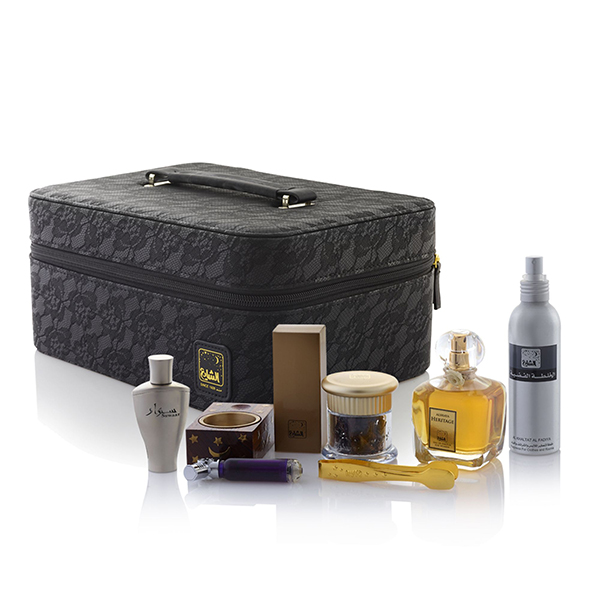 A gift set of a perfume, concentrated perfume oil, khalta, bokhour mumasak, Incense burner, lighter, charcoal and a tweezer.