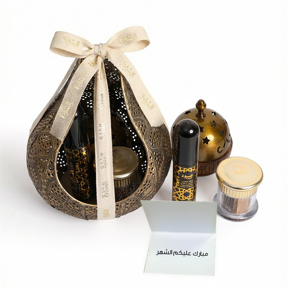 An elegant elegant gift featuring home fragrance essentials for simple and lasting use throughout the holy month, it includes a modern incense burner with a contemporary design, a metal evaporator holder for safe use, daily incense 15g, and a home air freshener for instant freshness.