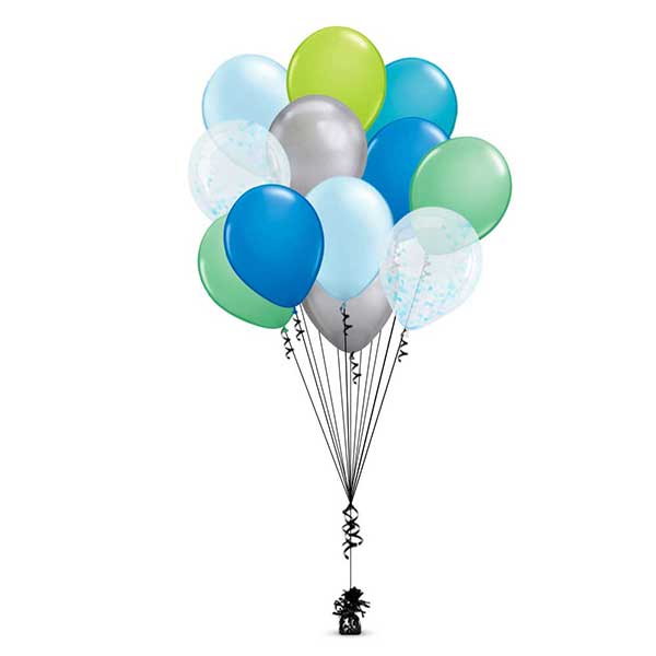 25 pieces in a Balloon Bunch in Dark Blue, Light Blue, White and Clear Blue Confetti.