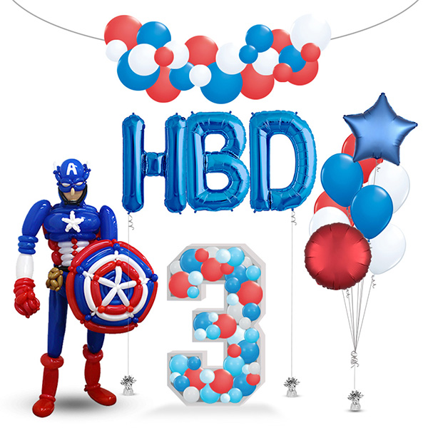 1 piece 2 meter hanging garland balloon 1 piece 1 meter height number frame balloon 1 piece 34 inch Letter H Blue Foil Balloon 1 piece 34 inch Letter B Blue Foil Balloon 1 piece 34 inch Letter D Blue Foil Balloon 6 piece 11 inch Latex Balloon in Red, Blue and White 1 piece 20 inch Star Blue Foil Balloon 1 piece 20 inch Round Red Foil Balloon 1 piece Captain American Balloon Sculpture Size 150cm height x 60cm width Note: This product will be available after (1)one day of booking date.