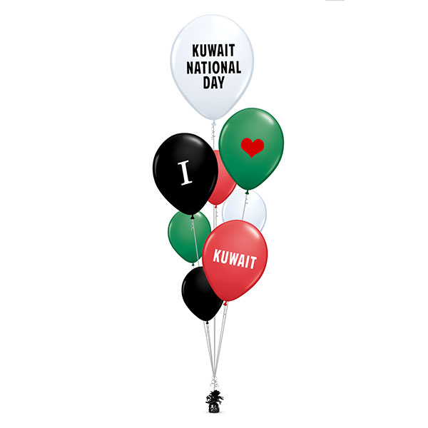 1 piece 24 inch white latex balloon "Kuwait National Day" message sticker in black. 3 pieces 16 inch latex balloons with an individual sticker message: “I” for the black balloon, “red heart” sticker in dark green balloon, “Kuwait” in white sticker in red balloon. White string and black weights to hold the balloons. All balloons are inflated with helium.