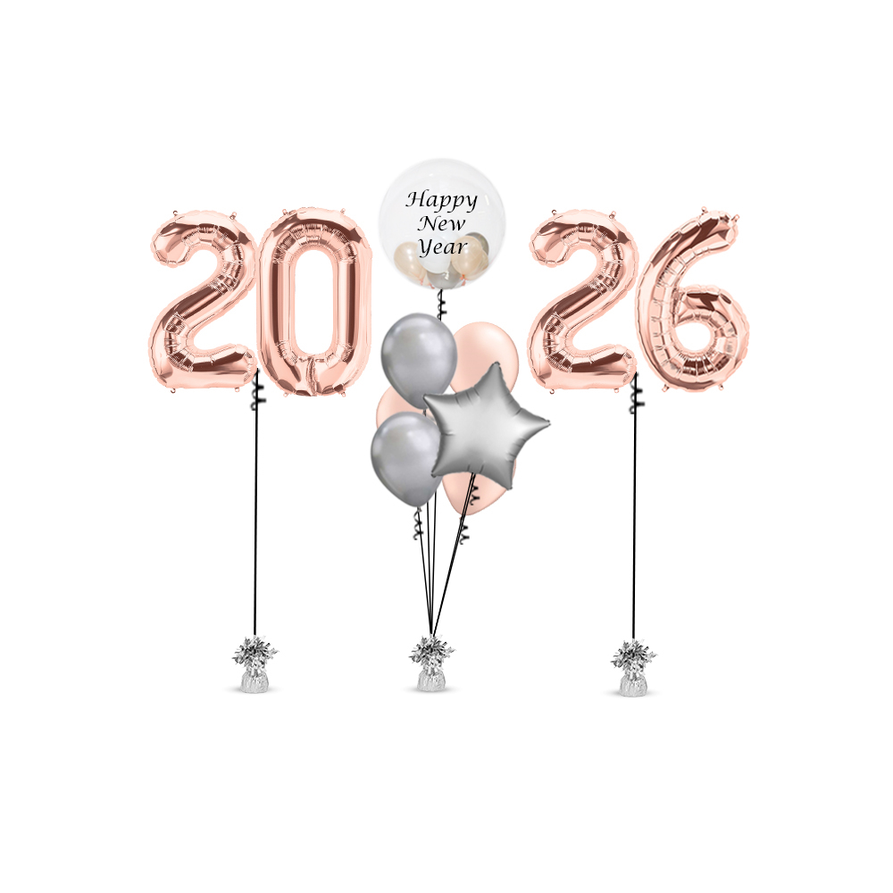 A 2026 large numbers in rose gold with silver weights and string to hold the balloons, 1 piece 24" inch clear bubble balloon with 5" balloons inside in peach, silver & white and "happy new year" statement in black sticker, 1 piece 11" diamond clear later balloon with confetti inside in peach, white & dark pink. 2 pieces 11" silver chrome latex balloon, 1 piece 11" white latex balloon, 1 piece 11" star silver balloon, silver string and weights to hold the balloons. All balloons are inflated with helium.