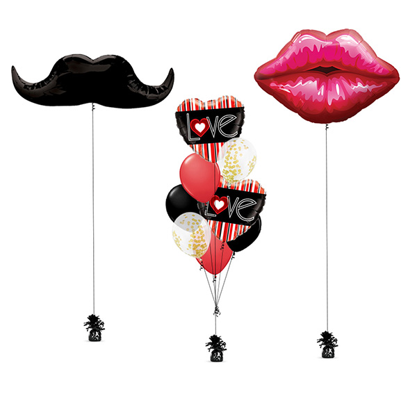 1 Piece 36 inch lips balloon. 1 piece 32 inch mustache balloon. 2 piece 18 inch love heart balloon. 6 piece 11 inch latex balloon in red, black and confetti gold. Ribbon and weight to hold the balloon. All balloons are inflated with helium.
