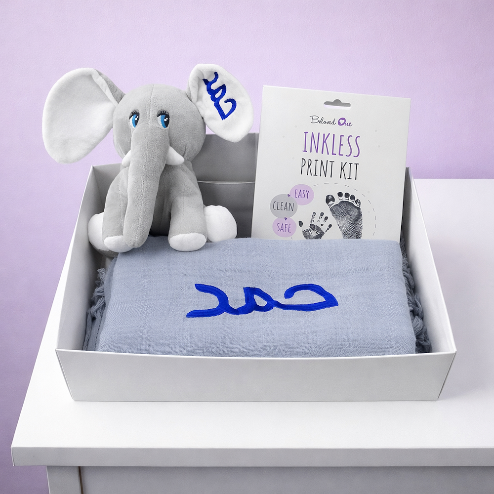 A unique set contains 2 bibs, pacifier hanger and baby teether. With 100% cotton fabric, name can be personalized in Arabic or English.
