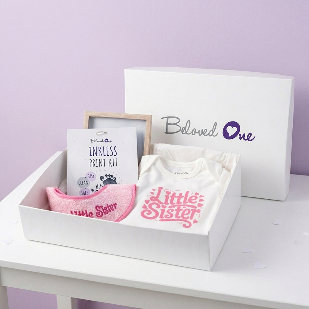 Exclusive gift set for new born babies that includes a bodysuit, baby bibs with " little sister " message and the inkless print kit, lets make unforgettable gifts.