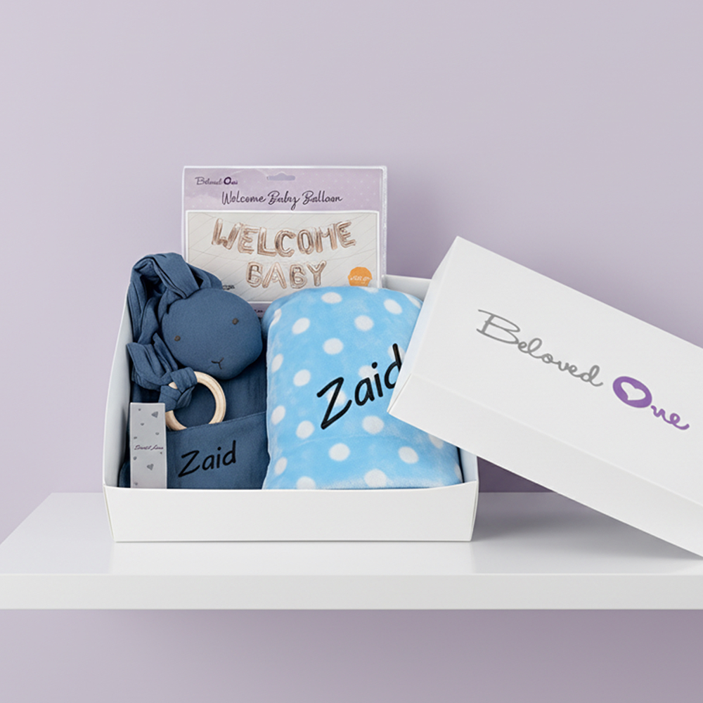 The welcome set includes a cute teddy bear toy, a mini blanket, a bibs set, and a welcome baby balloon, making it the perfect gift for your loved one. The name can be personalized in Arabic or English, adding a special touch to this thoughtful and heartwarming present.