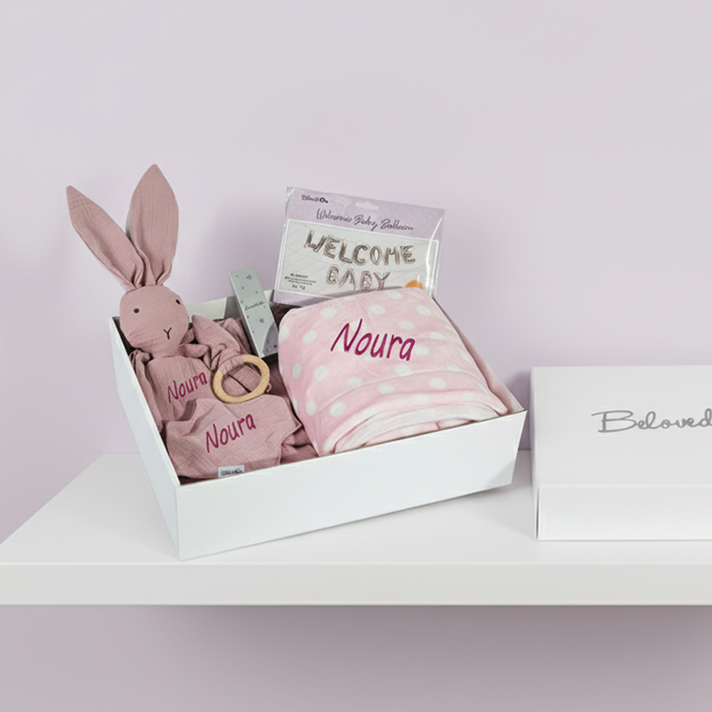 The welcome set includes a cute teddy bear toy, a mini blanket, a bibs set, and a welcome baby balloon, making it the perfect gift for your loved one. The name can be personalized in Arabic or English, adding a special touch to this thoughtful and heartwarming present.