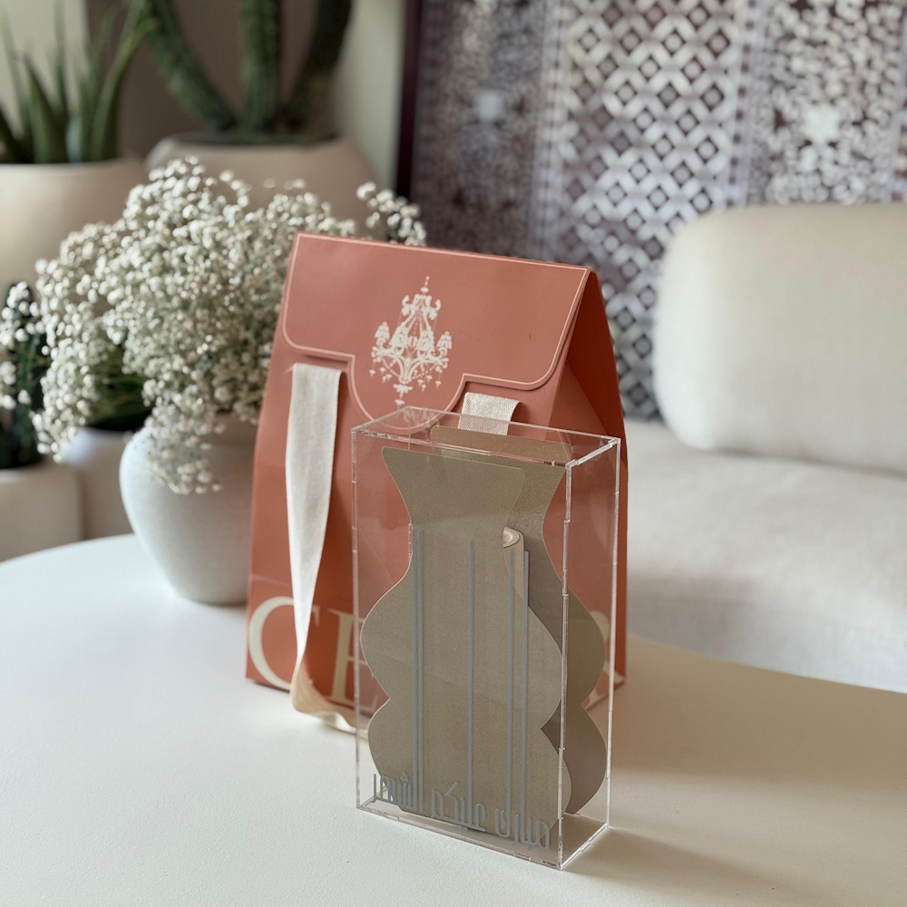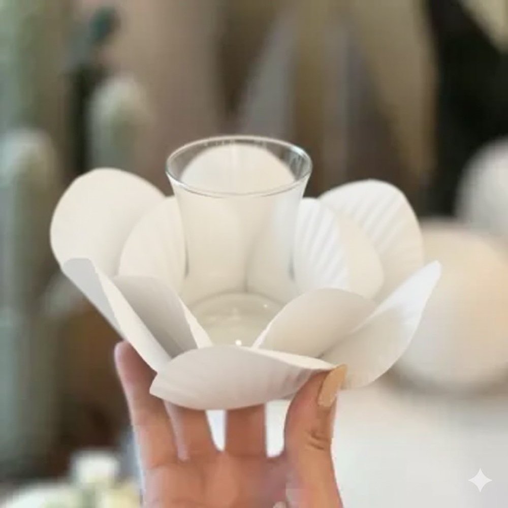 An acrylic box containing 6 iron flower-shaped coasters and 6 glass tea cups.